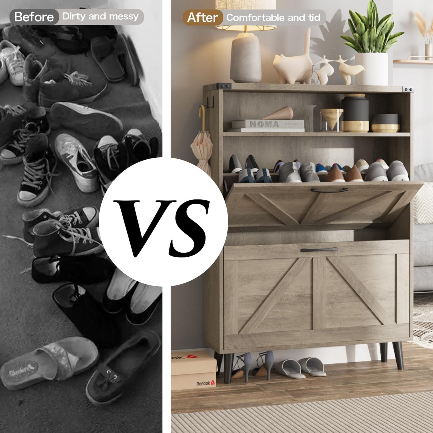 - 【Flip Drawers Shoe Cabinet】Our drawers shoe cabinet has two flip drawers and 2 tiers inside each drawer,It features a removable divider in each compartment, you can choose to keep or remove the panel according to the size or style of your shoes.
