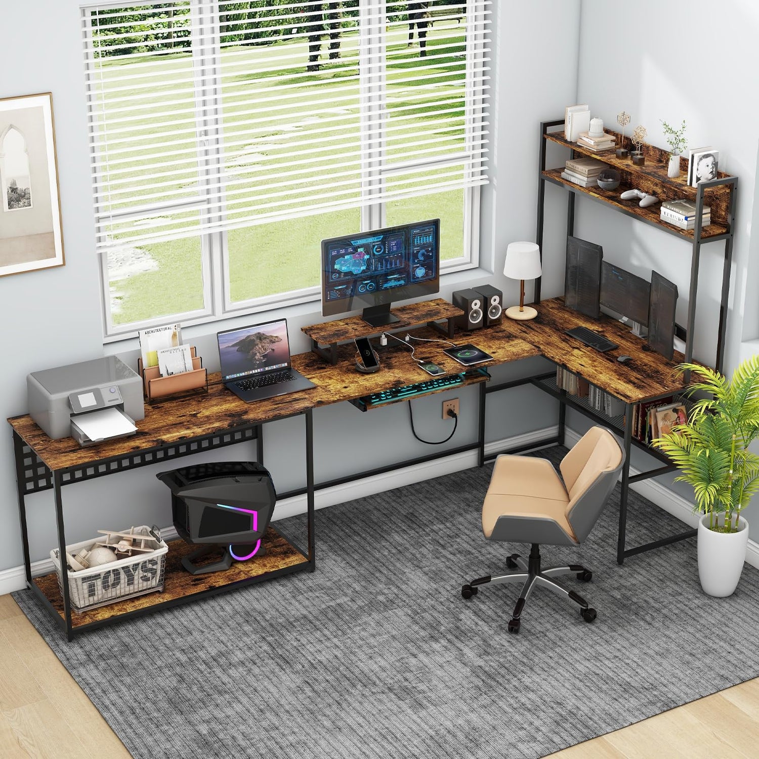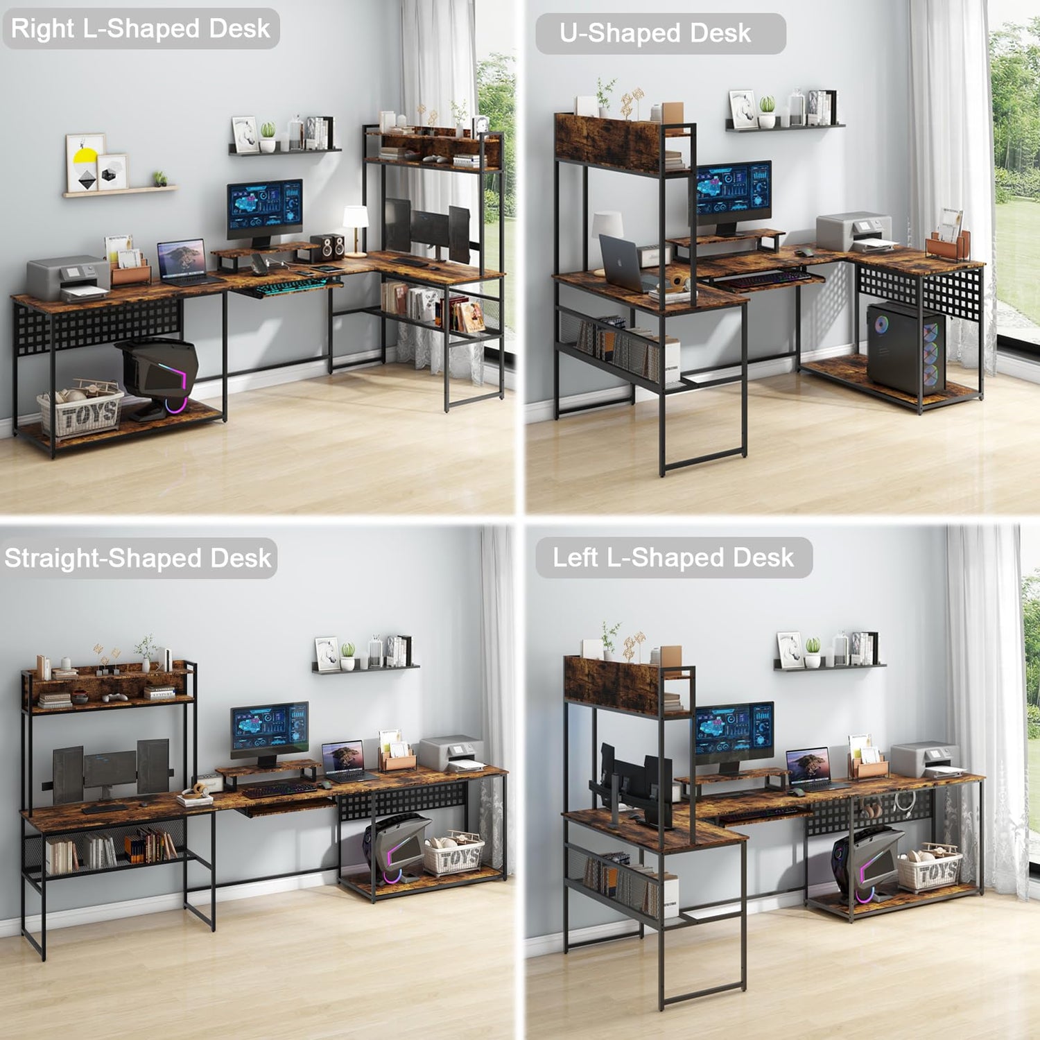 Halitaa U Shaped Desk with Power Outlet, L Shaped Office Desk with LED Lights and Monitor Stand, Reversible L-Shaped Computer Desk Suitable for Home Office, Corner, Gaming, Brown