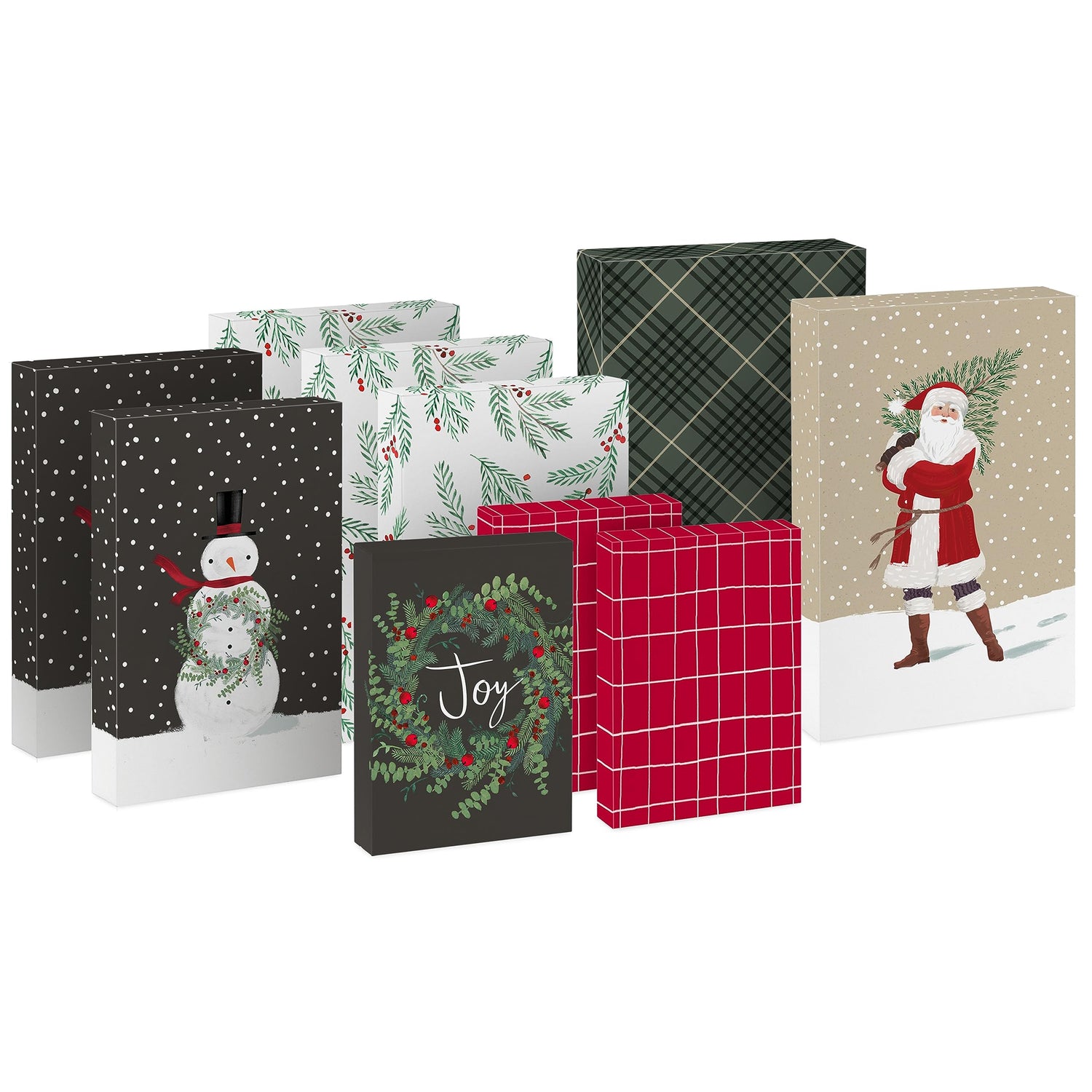 Hallmark Christmas Shirt Boxes for Presents (10 Clothes Boxes with Lids: 3 Small 11", 5 Medium 14", 2 Large 16") Red, Green and Black Plaid, Snowmen, Santa, Winter Greenery