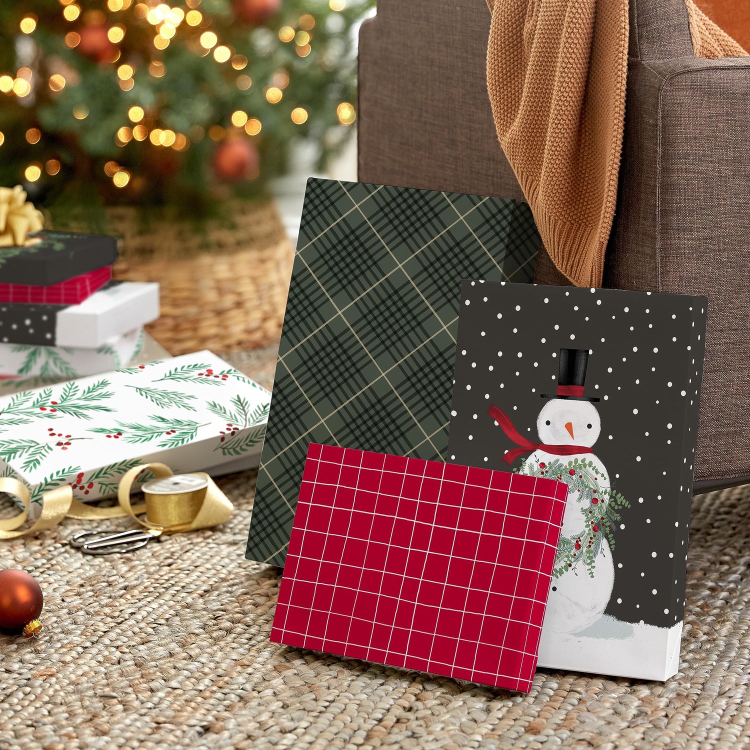 - FESTIVE DESIGNS: Variety of designs include rustic snowman on black, red and white windowpane plaid, evergreen sprigs, wreath, Santa and more; Decorated boxes save you the step of wrapping, and coordinating designs look impressive under the tree