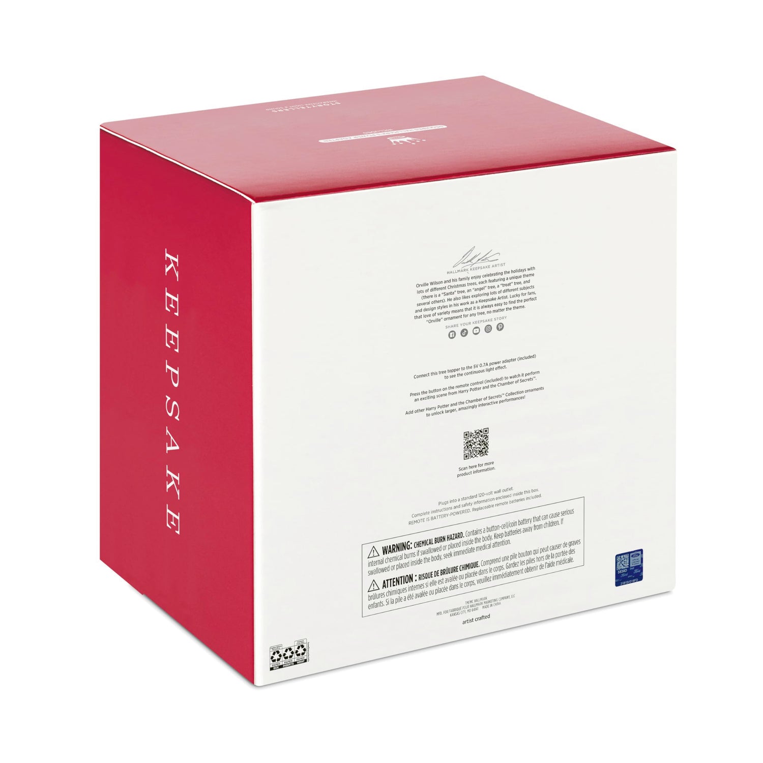 - Purchase Includes: Keepsake Christmas tree topper and remote control in gift box for easy gift giving, preservation and storage. Requires power adapter (included) that plugs into a standard 120-volt wall outlet. Remote control requires two (2) LR44 replaceable batteries (included).