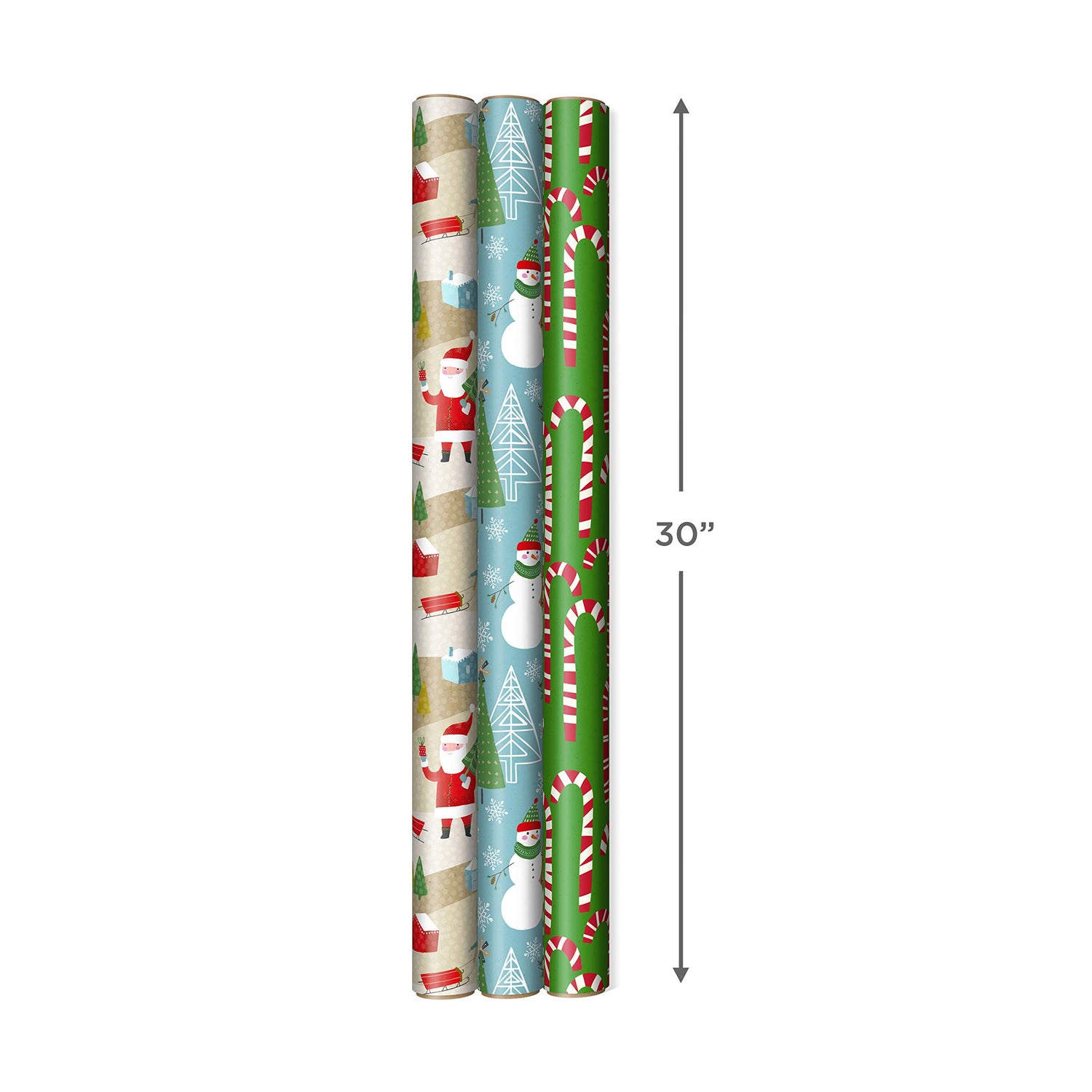 Hallmark Reversible Christmas Wrapping Paper (3 Rolls: 120 sq. ft. ttl) Rustic Santa, Papercraft Snowmen, Candy Canes, Stripes, Snowflakes, "Merry Christmas to You"