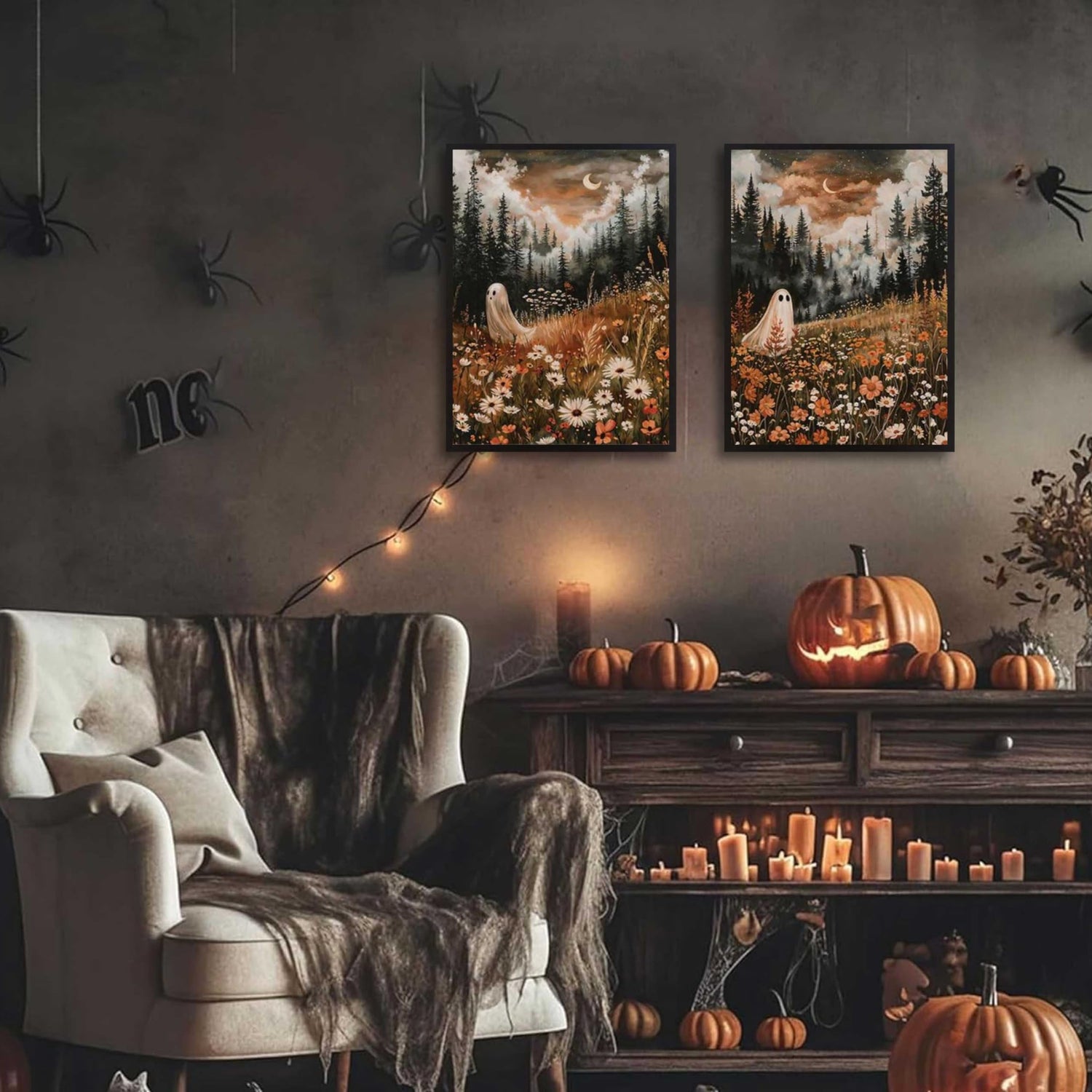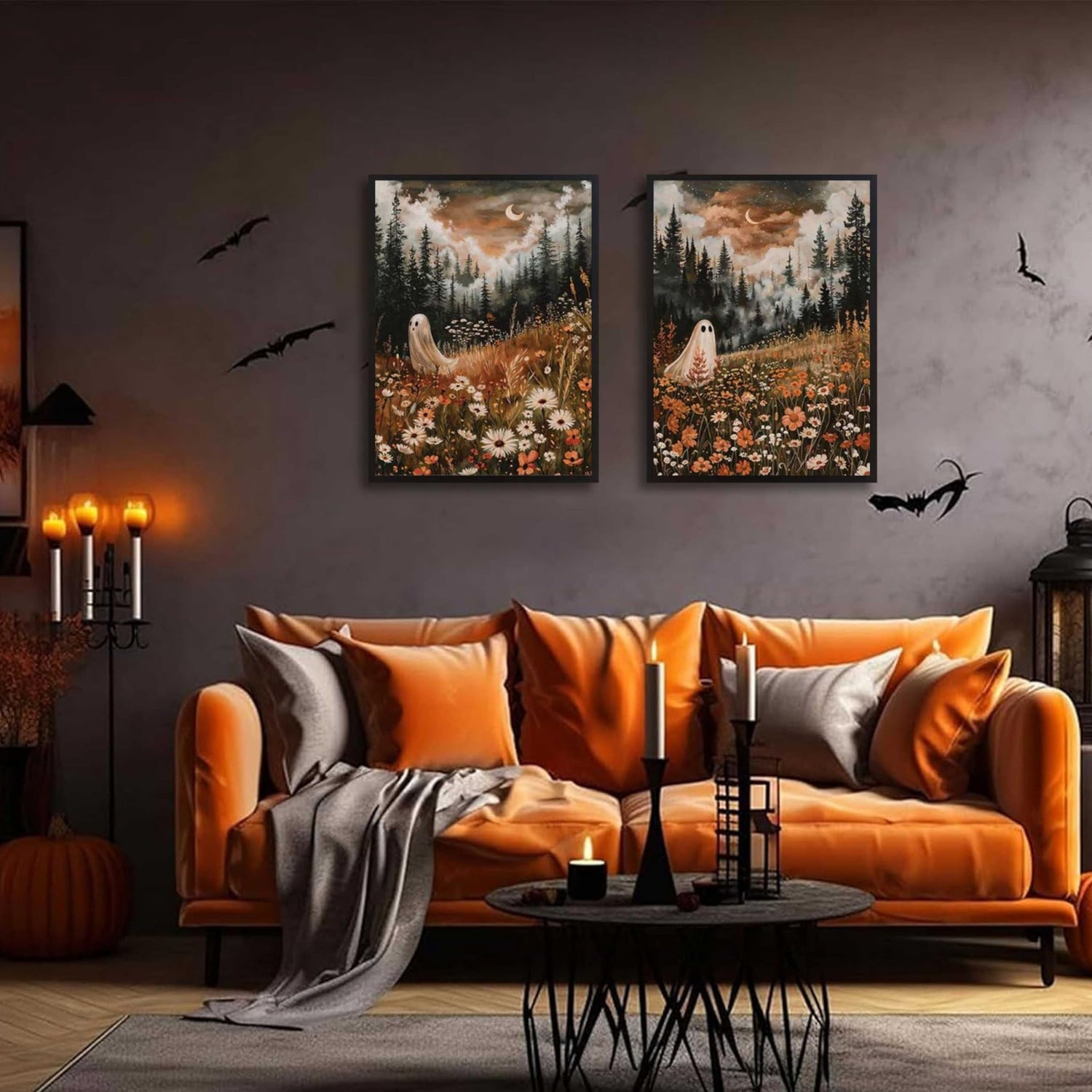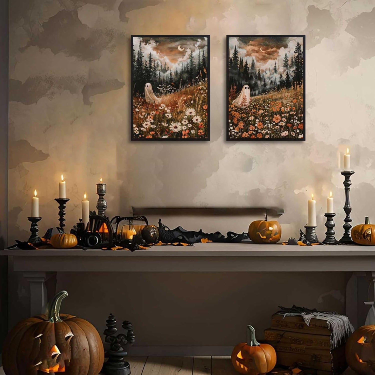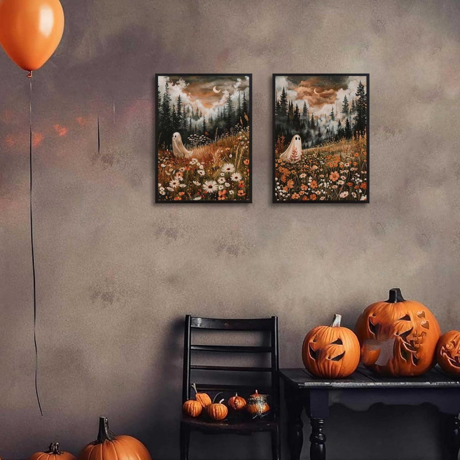 - Enchanting Whimsical Themes: Features two captivating scenes of a ghost amidst vibrant floral meadows under a moonlit forest sky. Perfect for capturing the magic of autumn and the spooky charm of Halloween