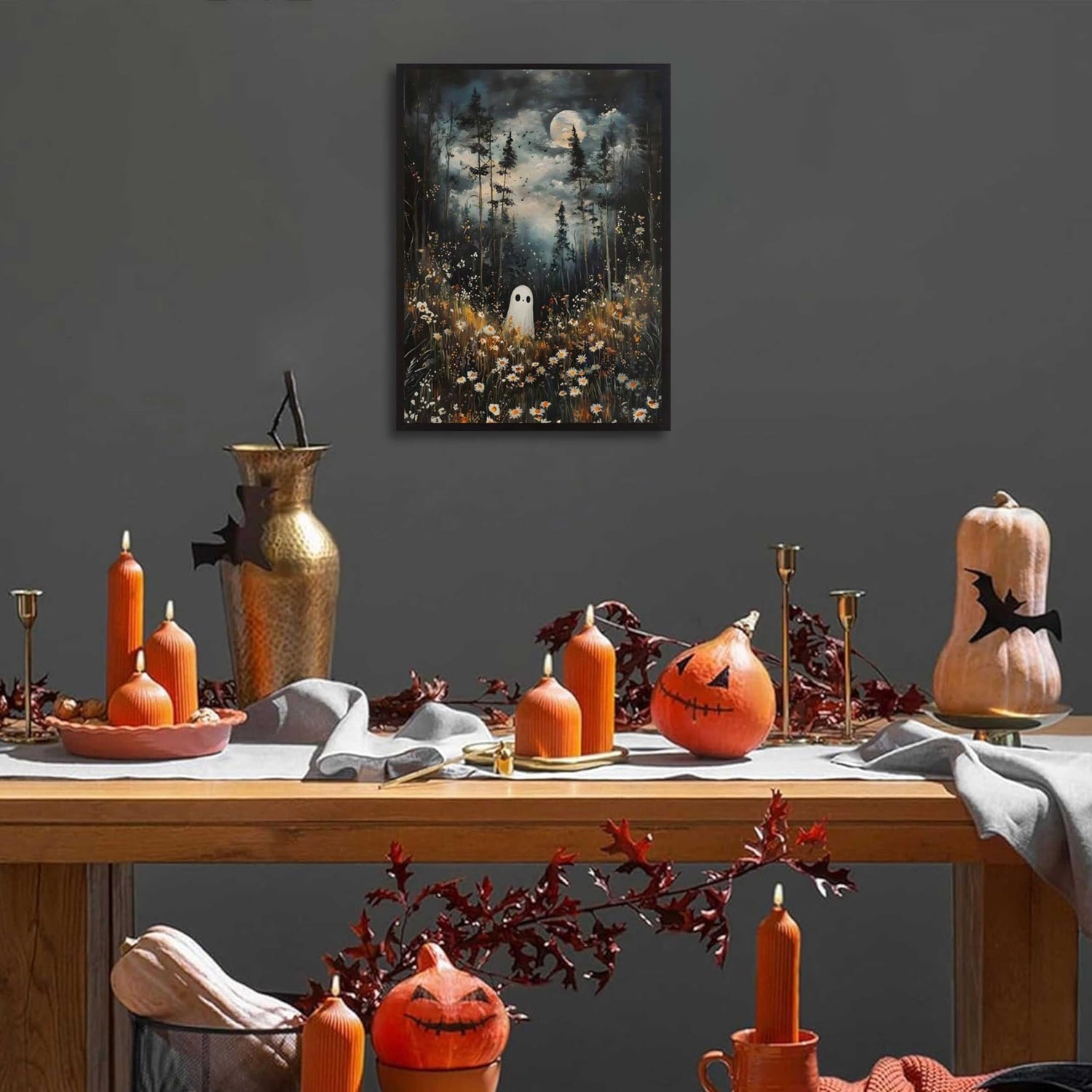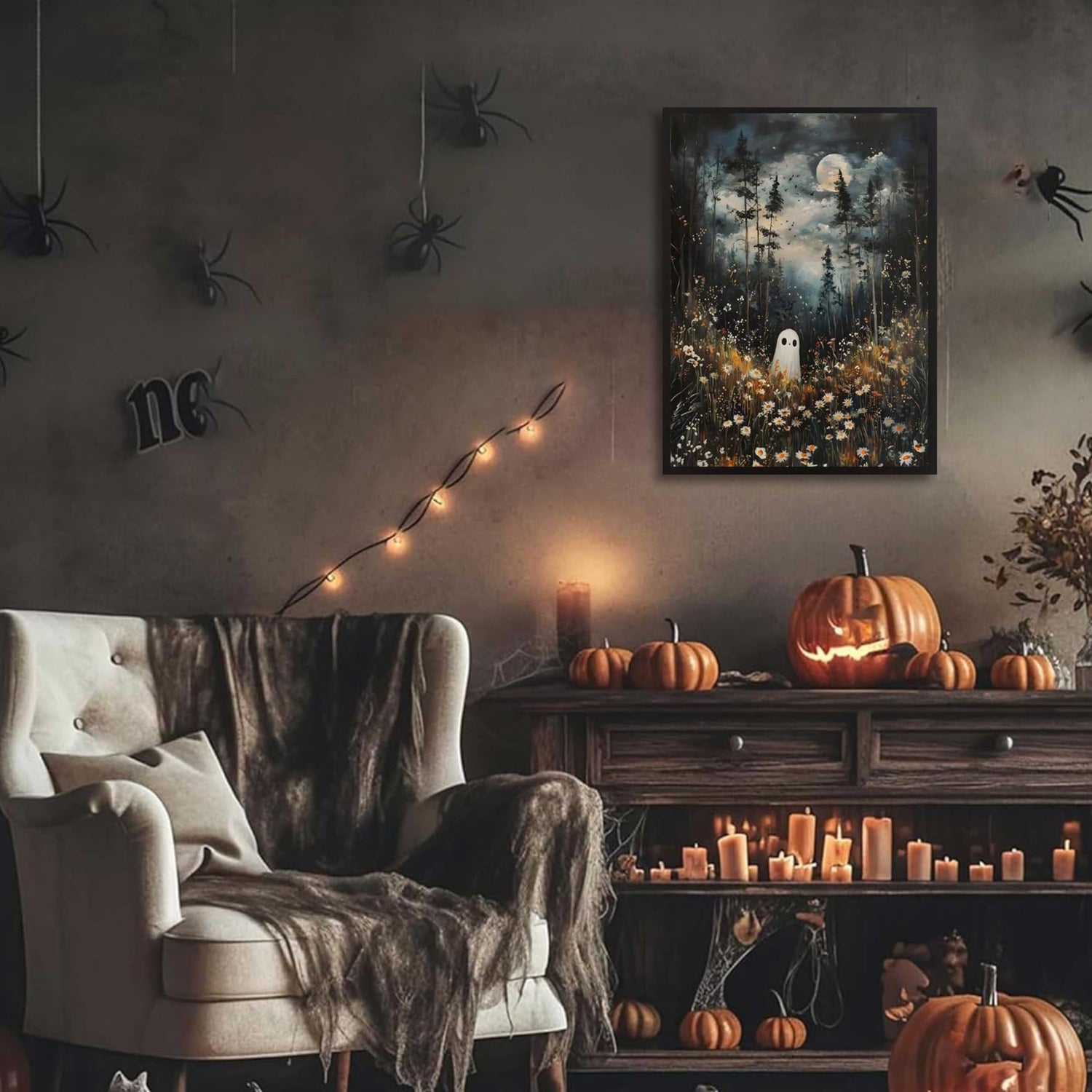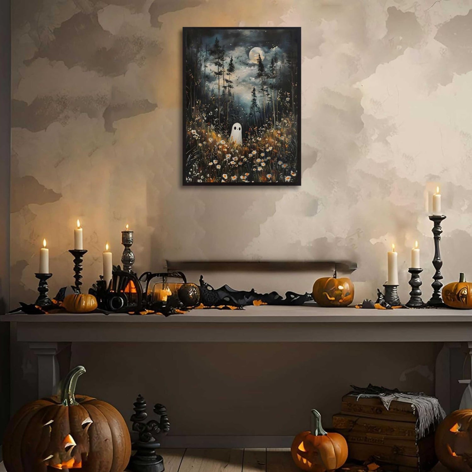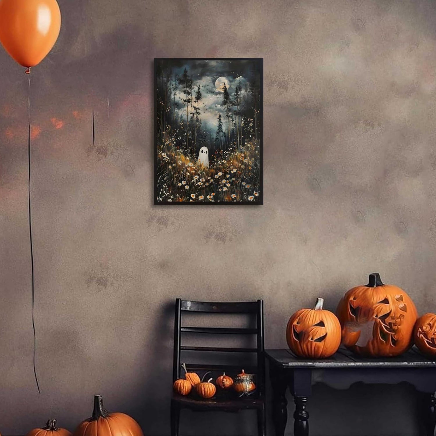 - Enchanting Halloween Scene: Features a cute ghost amidst a vibrant floral meadow under a moonlit forest sky. Perfect for capturing the spooky yet charming essence of Halloween