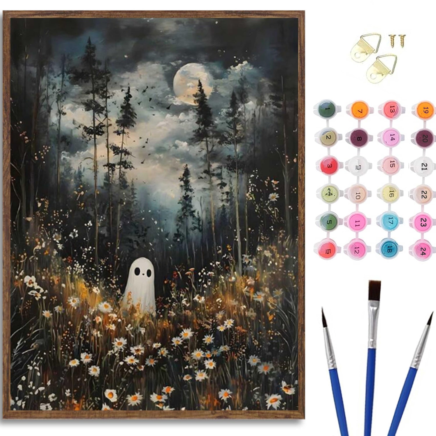 Halloween Whimsical Ghost Paint by Number Kit, 16x20inch Moonlit Forest Floral Meadow DIY Painting for Adults and Kids Art Craft Supplies Frameless