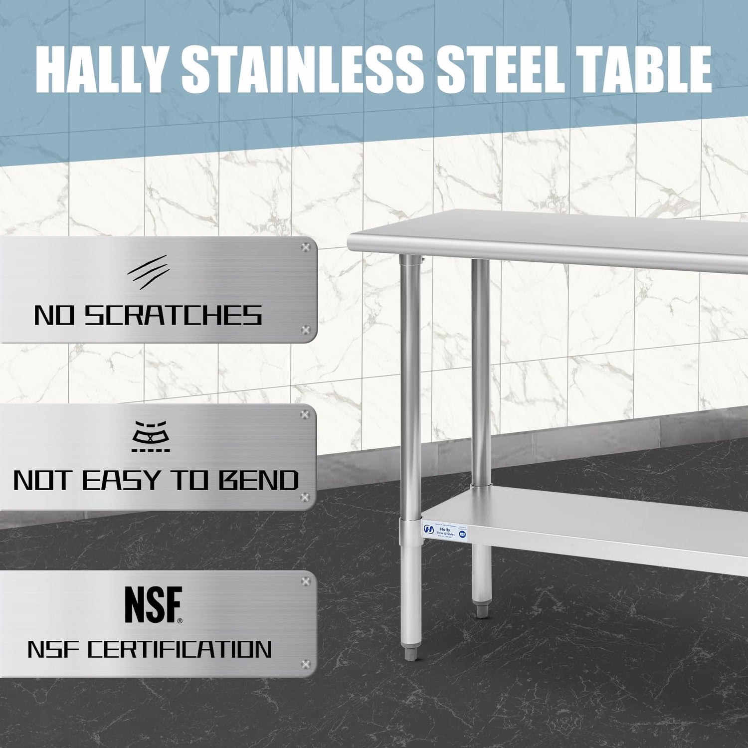 Hally Stainless Steel Table for Prep & Work 18 x 48 Inches, NSF Commercial Heavy Duty Table with Undershelf and Galvanized Legs for Restaurant, Home and Hotel