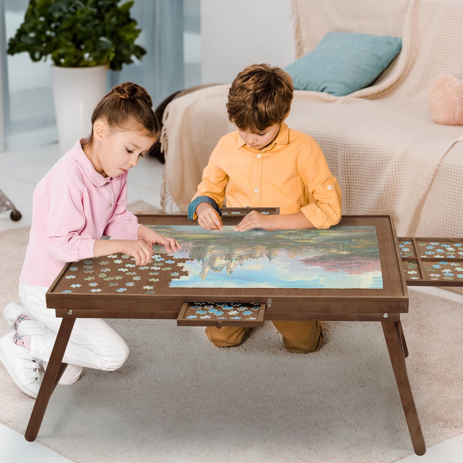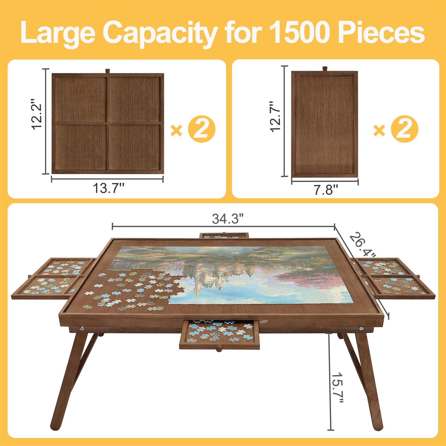 - 【1500 Pieces Puzzle Table】Measuring usage area of 34.3"W x 26.5"D, applicable to jigsaw puzzle games up to 1500 pieces, suitable for most puzzles in the market. The jigsaw puzzle board is 15.7 inches high, allowing you to sit comfortably on the carpet and play puzzle games instead of having to bend down
