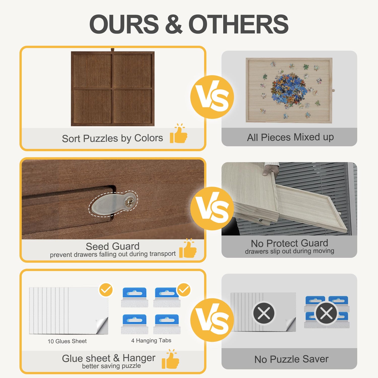 - 【4 Drawers with Seed Buckles】Equipped with 4 dividers drawers, keep them categorized while starting your puzzle, allow you to sort your pieces by color, theme or border, making it easier to complete your puzzles. The drawers with seed buckle to prevent them from falling out during transport, keeping your puzzles intact