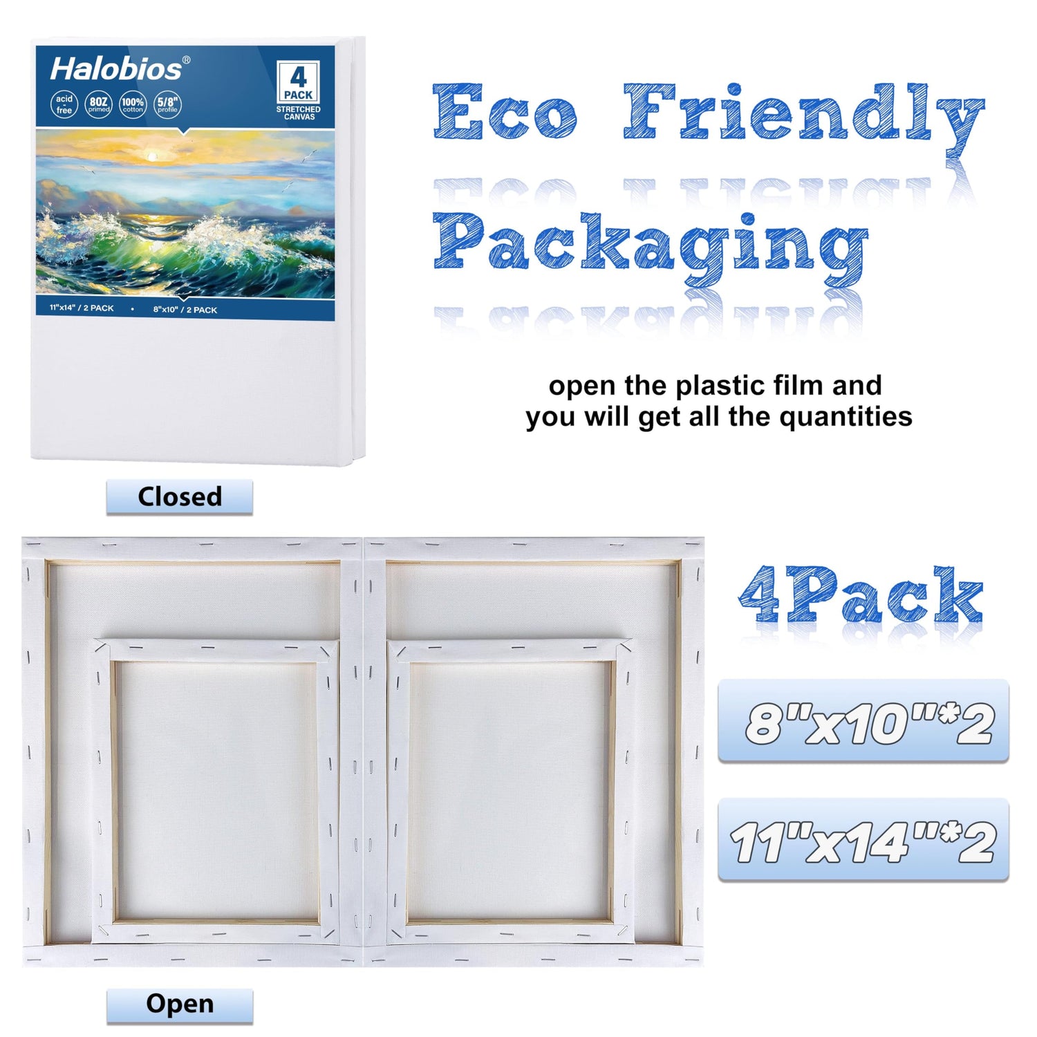 Halobios 4 Packs Blank Canvases for Painting with 8x10in,11x14in(2 of Each), Stretched Canvases for Acrylics, Oils & Other Painting Media, 100% Cotton, 5/8 Inch Profile of Super Value Canvas Pack