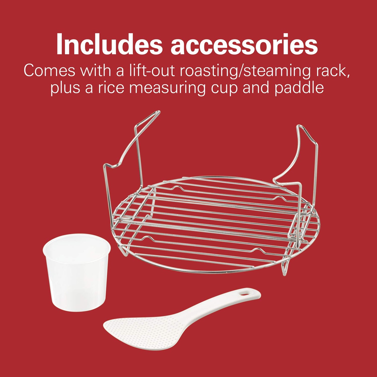 - ACCESSORIES INCLUDED: Comes with a lift-out roasting/steaming rack for meats or vegetables, plus a rice paddle and rice measuring cup.