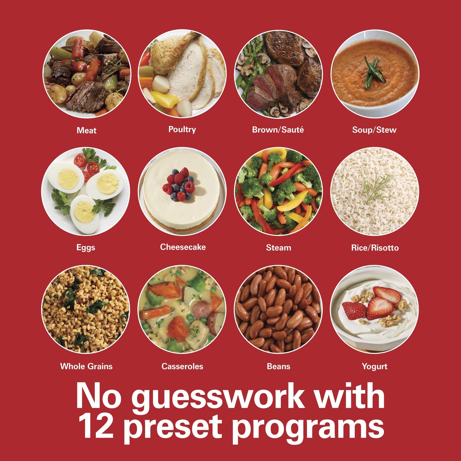 - TAKE THE GUESSWORK OUT OF COOKING: We make pressure cooking easy with 12 preset cooking programs for: meat, poultry, rice, steamed vegetables, beans, whole grains, casseroles, eggs, soup, yogurt and cheesecake.