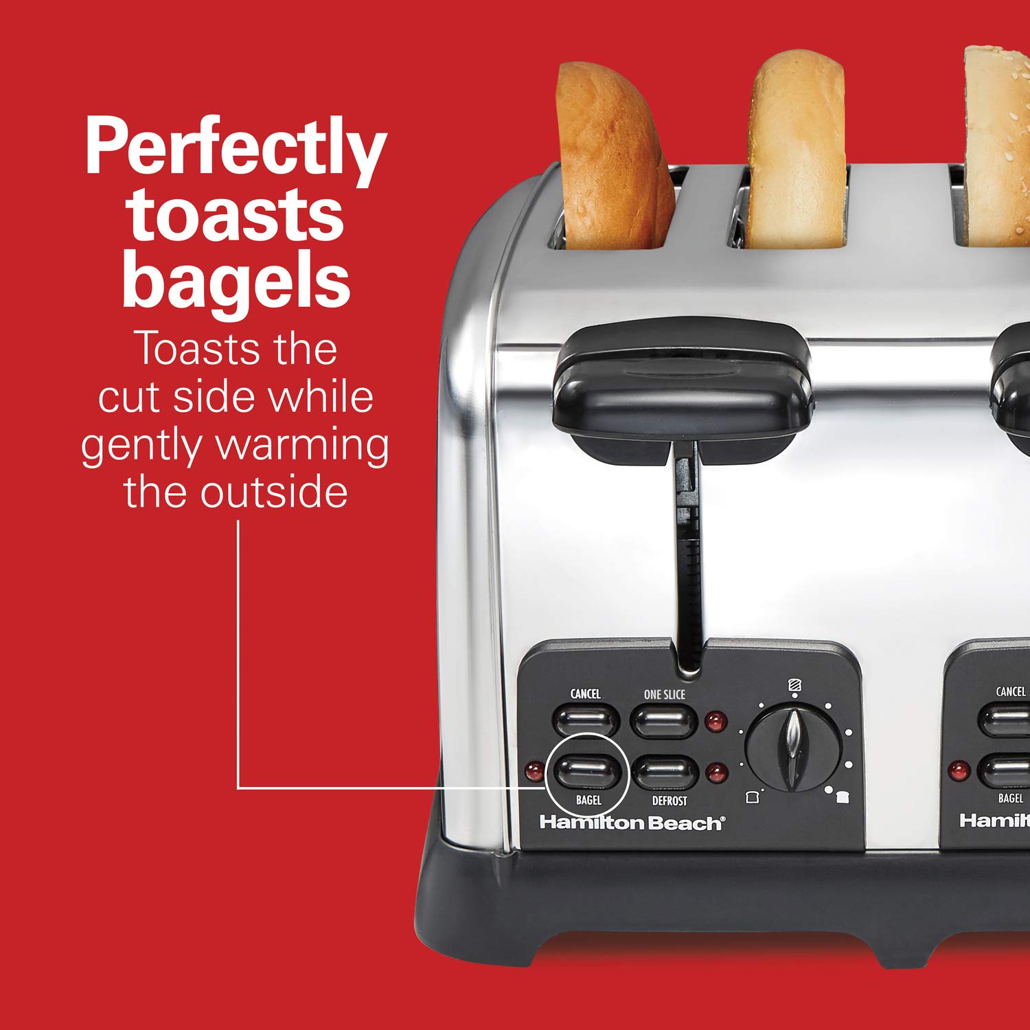 Details: The Hamilton Beach Classic 4 Slice Toaster with Sure-Toast technology evenly toasts both sides of bread, even when toasting a single slice. Features include bagel and defrost functions, and Auto Boost for lifting small breads from the toaster.