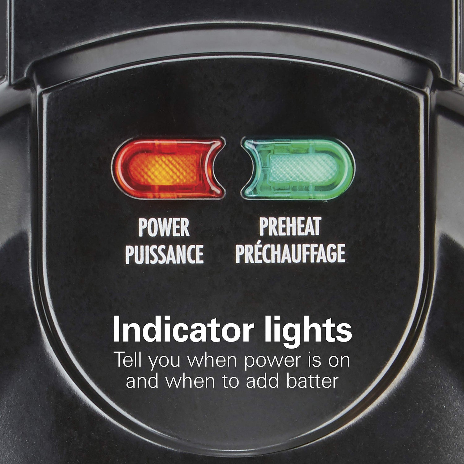 - INDICATOR LIGHTS: Power and preheat indicator lights tell you when power is on and when the Belgian waffle iron with removable plates is hot enough to add batter.