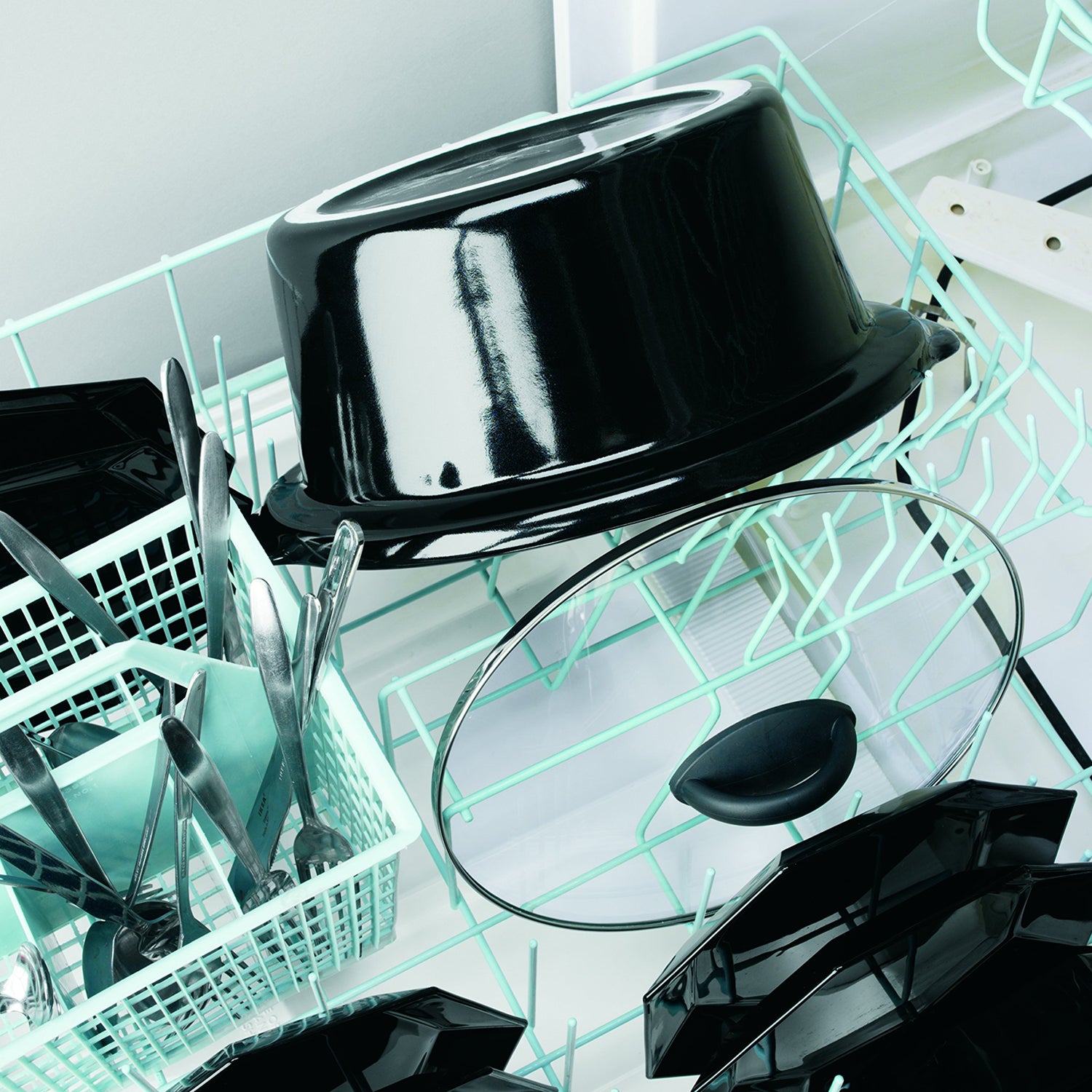 - Glass lid designed with stainless-steel rim and cool-touch knob