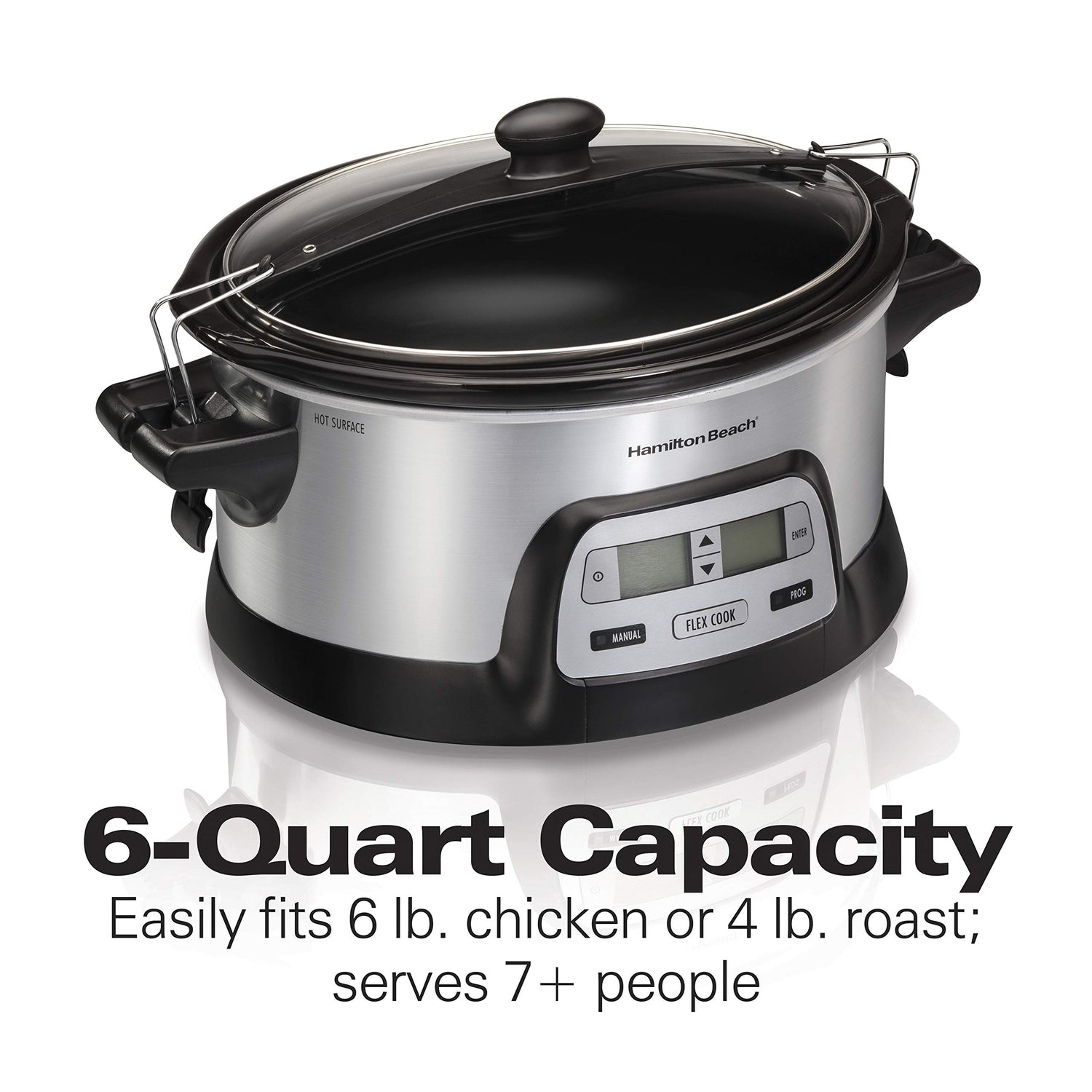 Details: Finally, a slow cooker that lets you program timing and heat setting to fit your schedule and your cooking style. With the Flex Cook Slow Cooker from Hamilton Beach, you can program two different heat settings and time durations in one cooking cycle, giving you greater flexibility in cooking your favorite recipes. For example, you can cook on high three hours, then low for six hours, or cook on low for four hours, then high for two. Program your slow cooker to automatically change temperature during a single cooking session3 programmable options: FlexCook mode, program mode and manual mode.
