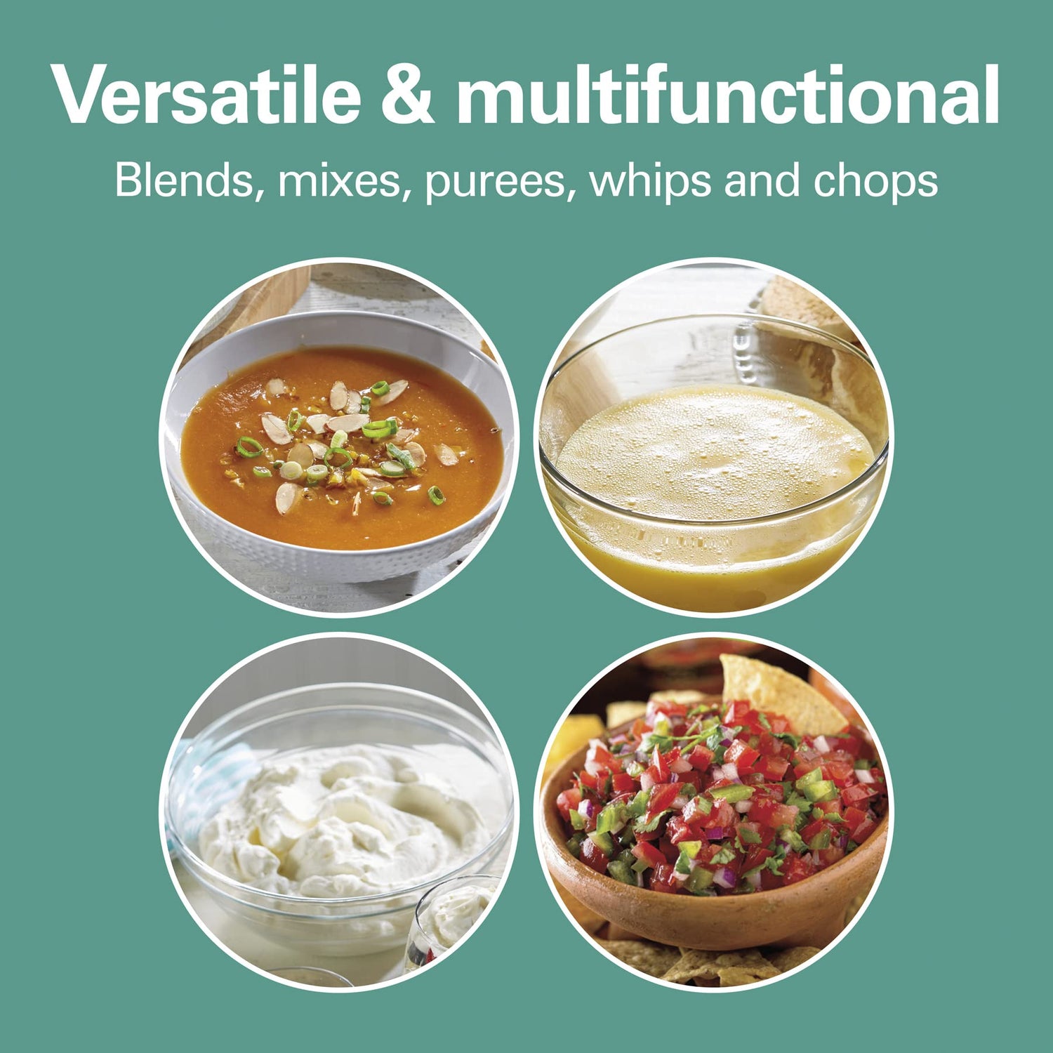 Hamilton Beach 4-in-1 Electric Immersion Hand Blender with Handheld Blending Stick, Whisk + 3-Cup Food & Vegetable Chopper Bowl, 2-Speeds, 225 Watts, Silver and Stainless Steel (59765)