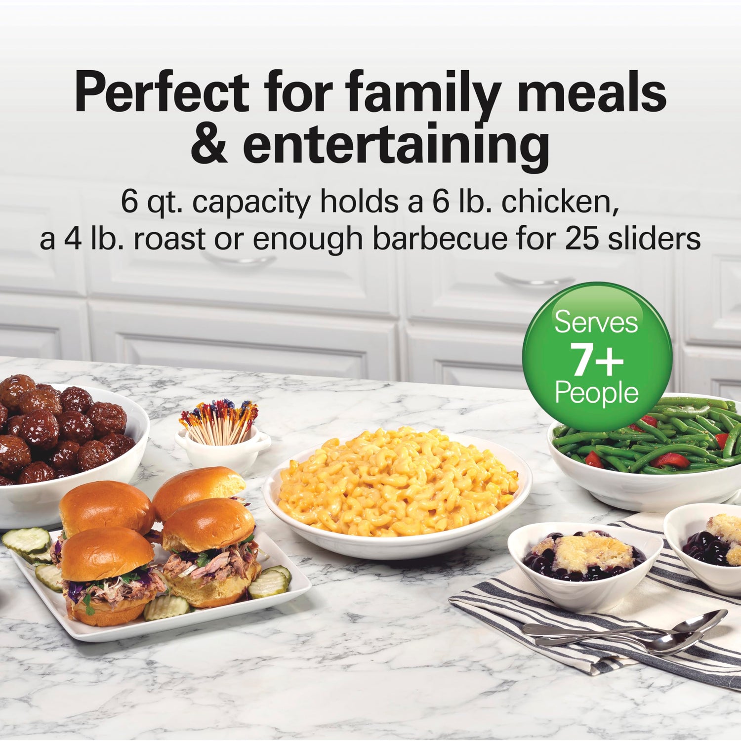 - PERFECT FOR FAMILY MEALS AND ENTERTAINING: The slow cooker has a large 6 quart stoneware crock that holds enough to serve 7+ people. It will fit a whole 6 lb. chicken, a 4 lb. roast or enough barbecue to make up to 25 sliders