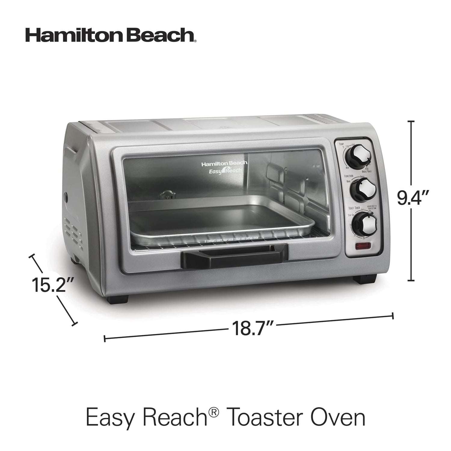 • FITS A 9" x 11" BAKE PAN, 6 SLICES OF TOAST OR A 12" PIZZA: This Hamilton Beach toaster oven has a spacious interior with plenty of room for cooking everything from snacks to side dishes.