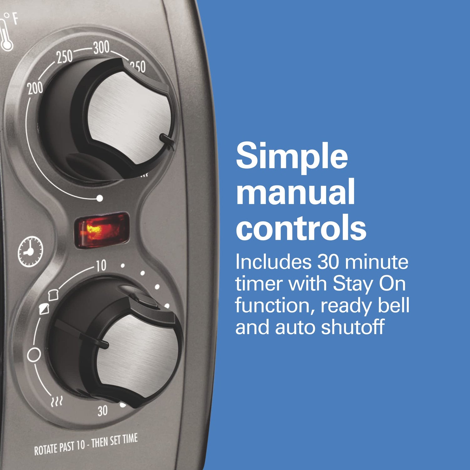 - SIMPLE MANUAL CONTROLS: This toaster oven has manual controls that are simple to use. Great for anyone who wants a toaster oven that gets the job done without being complicated. Includes 30 minute timer with Stay On function, ready bell and auto shutoff.