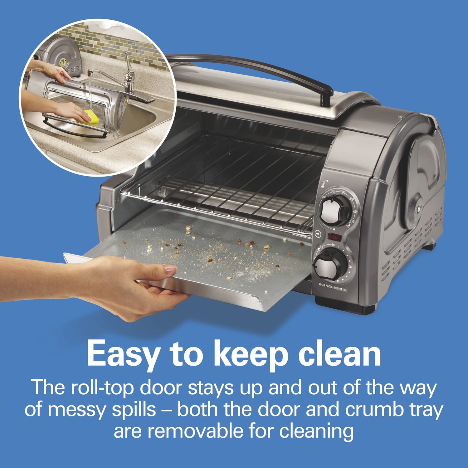 Hamilton Beach Easy Reach 4-Slice Countertop Toaster Oven With Roll-Top Door, 1200 Watts, Fits 9” Pizza, 3 Cooking Functions for Bake, Broil and Toast, Silver (31344DA)