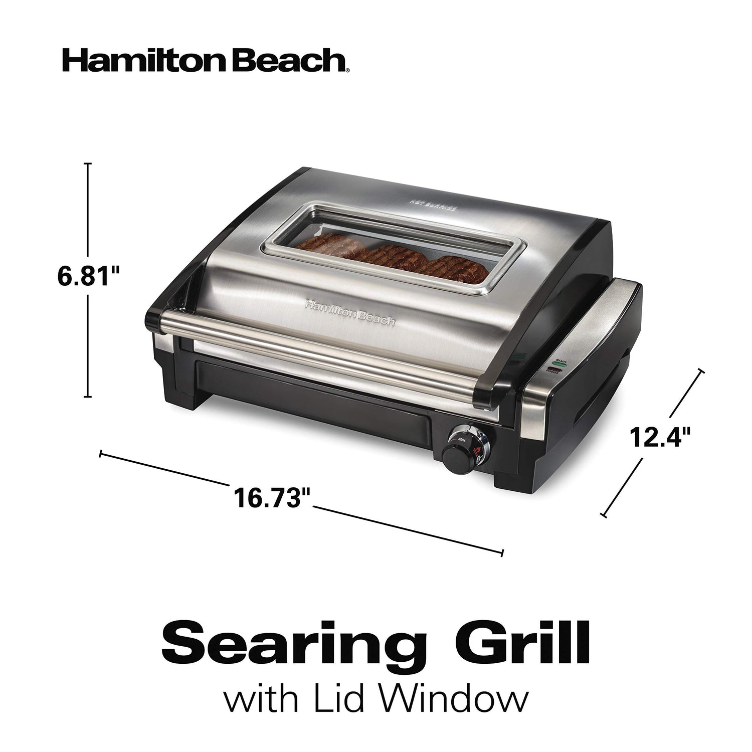 Hamilton Beach Electric Indoor Searing Grill with Viewing Window & Adjustable Temperature Control to 450F, 118 sq. in. Surface Serves 6, Removable Nonstick Grate, Stainless Steel