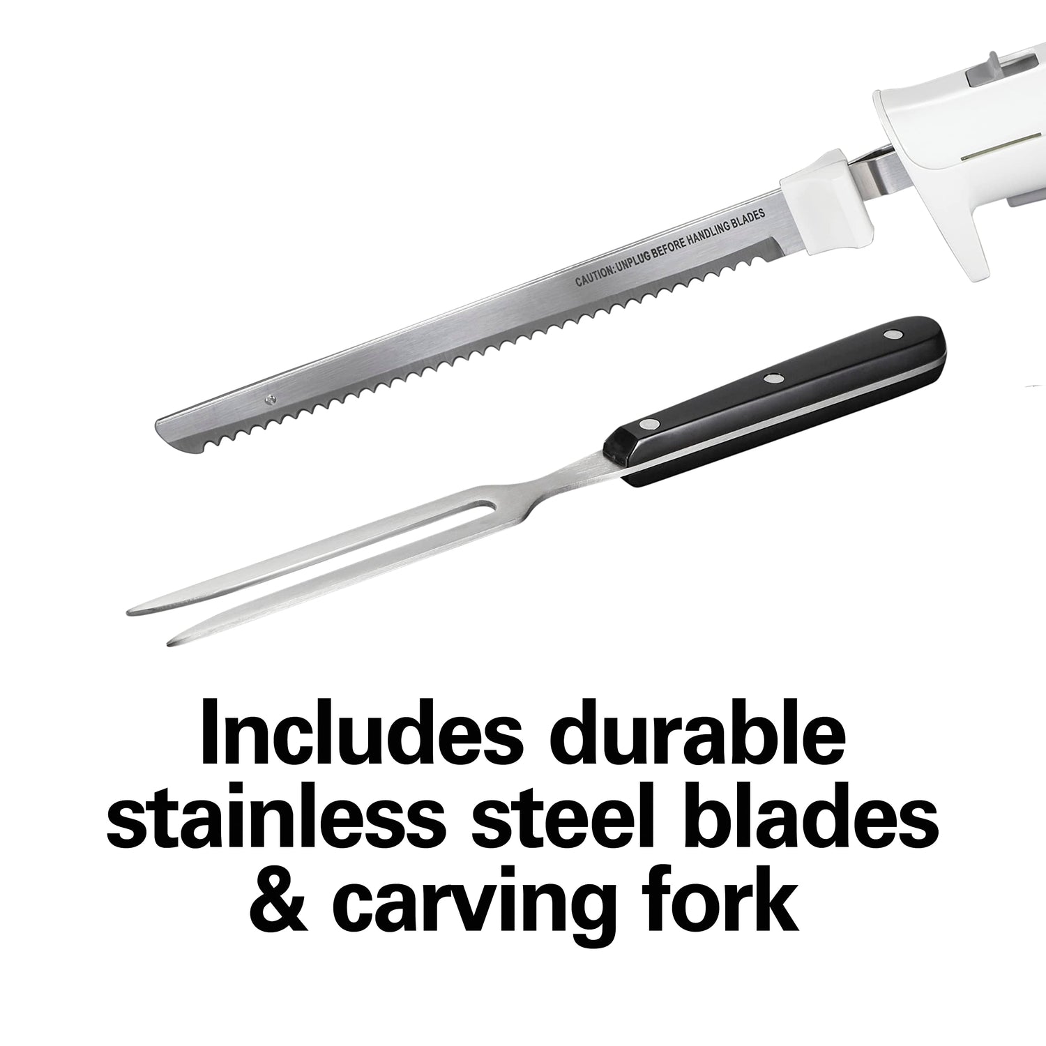 - SLICE QUICKLY & EVENLY: The electric carving knife's powerful 120 watt motor and reciprocating stainless steel blades with serrated edge give you the precision and control to cut quickly and evenly every time you slice.