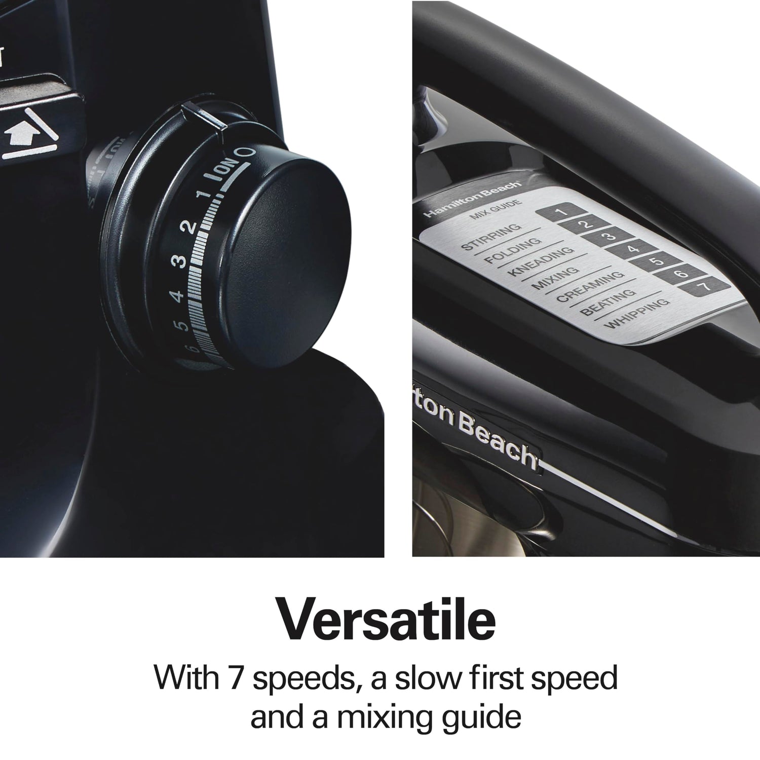 Hamilton Beach Electric Stand Mixer, 4 Quarts, Dough Hook, Flat Beater Attachments, Splash Guard 7 Speeds with Whisk, Black with Top Handle