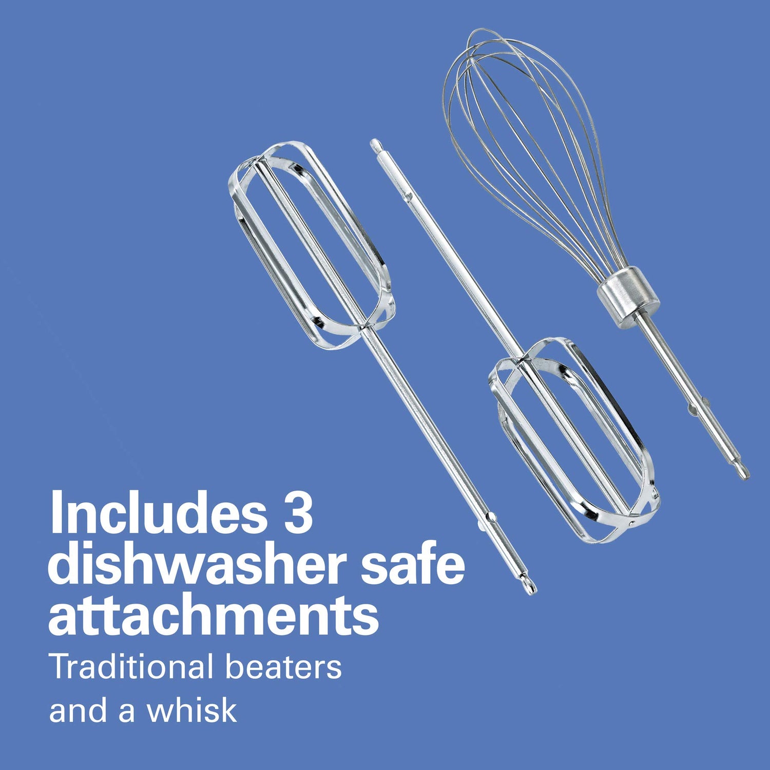 - INCLUDES COMPLETE 3 PIECE ATTACHMENT SET: The Hamilton Beach hand mixer includes everything you need to start mixing. It comes with 2 dishwasher safe traditional beaters and a whisk. All the accessories store neatly in the snap-on storage case