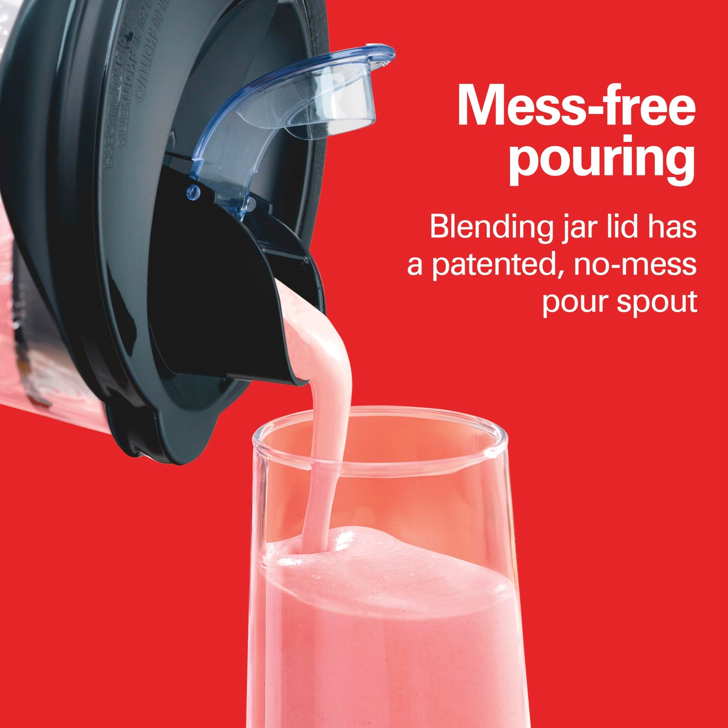 - Mess-free pouring. The 40 oz. glass blending jar features a lid with a patented, mess-free pour spout that’s designed to eliminate drips and spills. The pour spout can also be used for streaming in oils and other ingredients during blending.