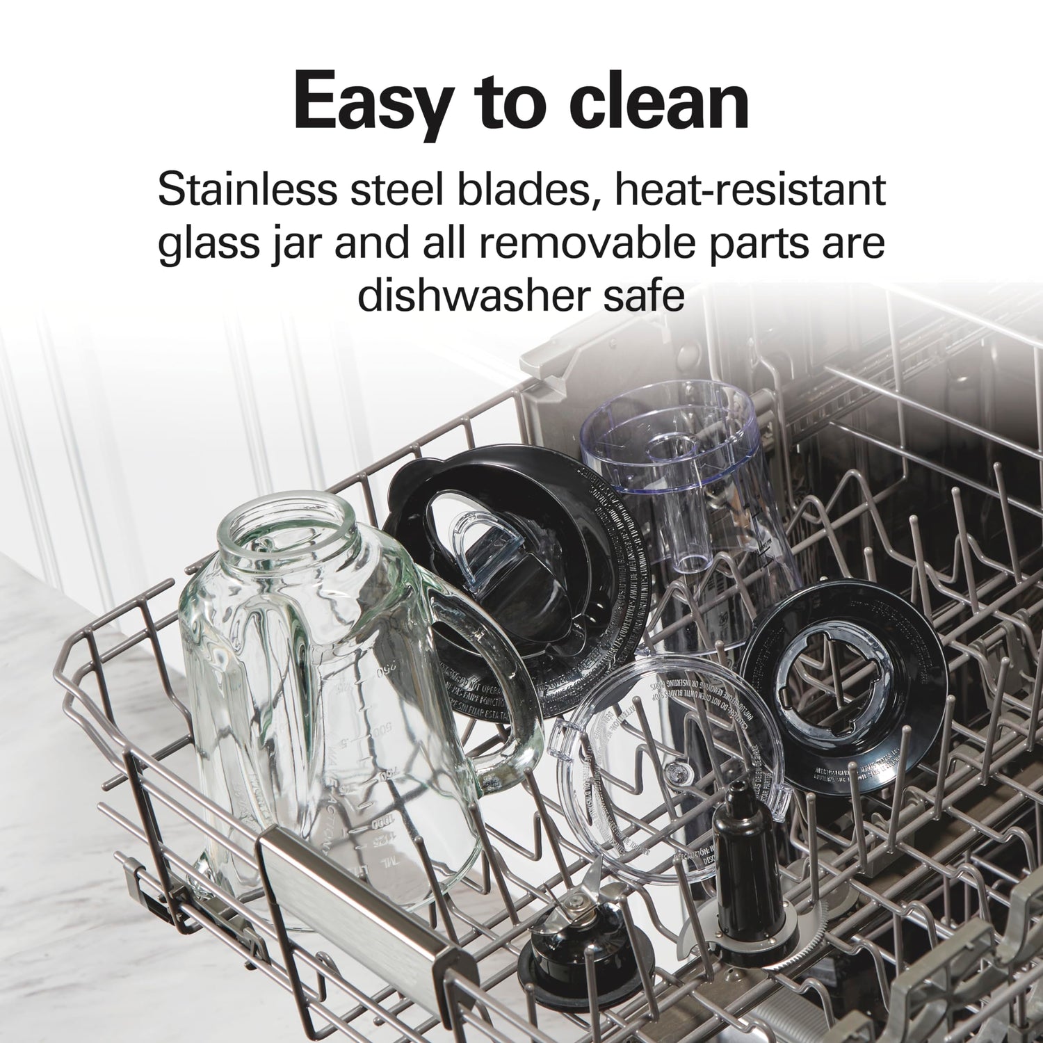 - Easy to clean. The removable stainless steel blending and chopping blades, the heat-resistant glass jar and all removable parts are dishwasher safe.