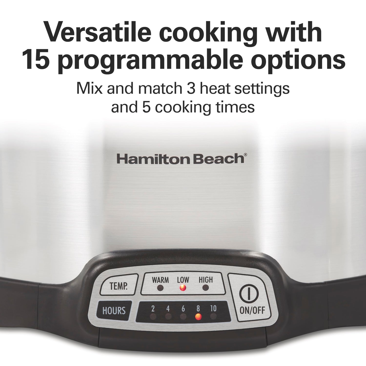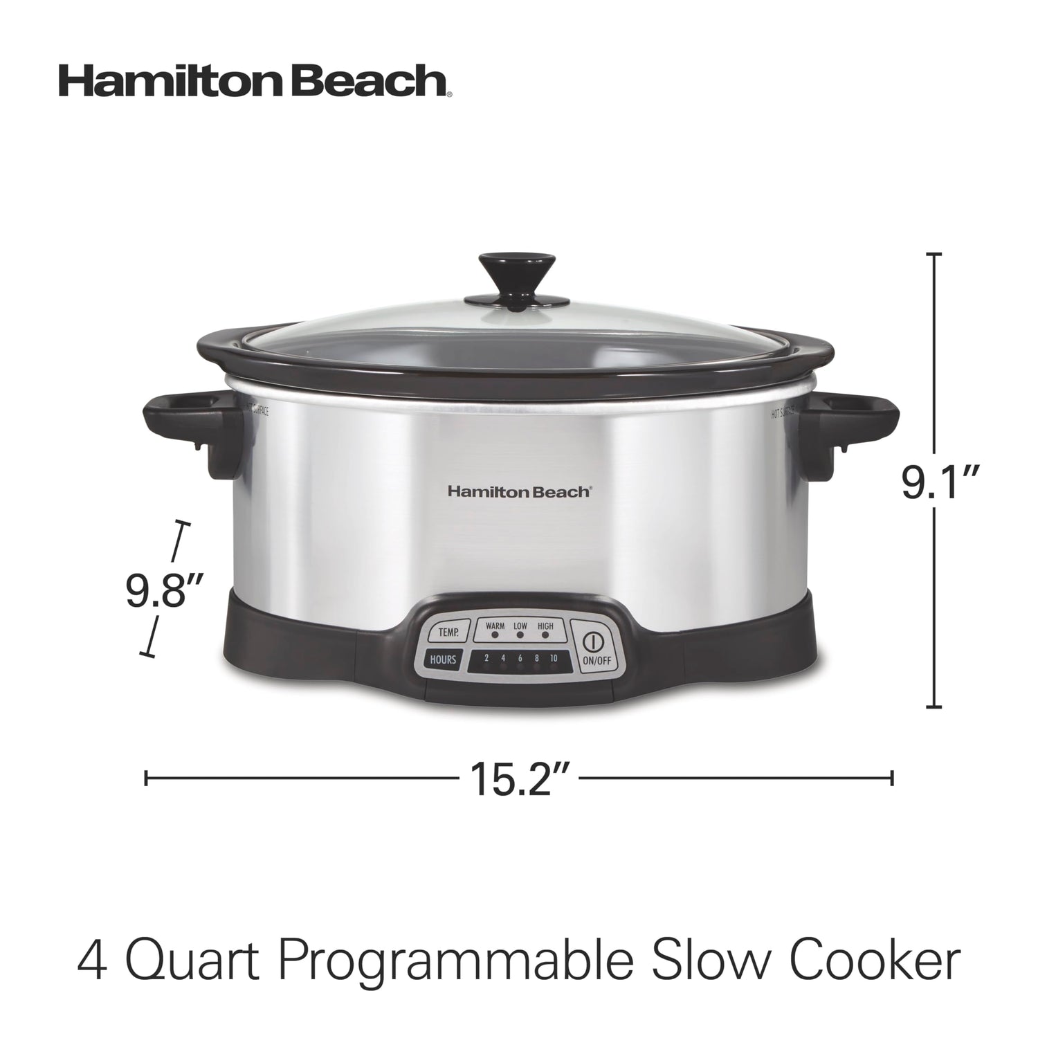 Details: Hamilton Beach programmable slow cooker know when dinner will be ready with flexible programming options. With the Hamilton Beach programmable slow cooker, making a delicious, home-cooked meal is as easy as putting a few ingredients in the Crock and turning it on. Its 4 quart Capacity and oval shape make it ideal for cooking a 4 lb. Chicken or roasting meat to perfection. And with more programming options than Crock-Pot Smart-Pot, this Hamilton Beach slow cooker gives you the ultimate selection of temperature and cooking time combinations. There's no need to monitor the cooking process - the wraparound element provides even heating that doesn't require stirring. Once cooking time is up, the slow cooker automatically switches to warm. When you're done, both the lid and Crock remove easily and can go into the dishwasher for cleanup.