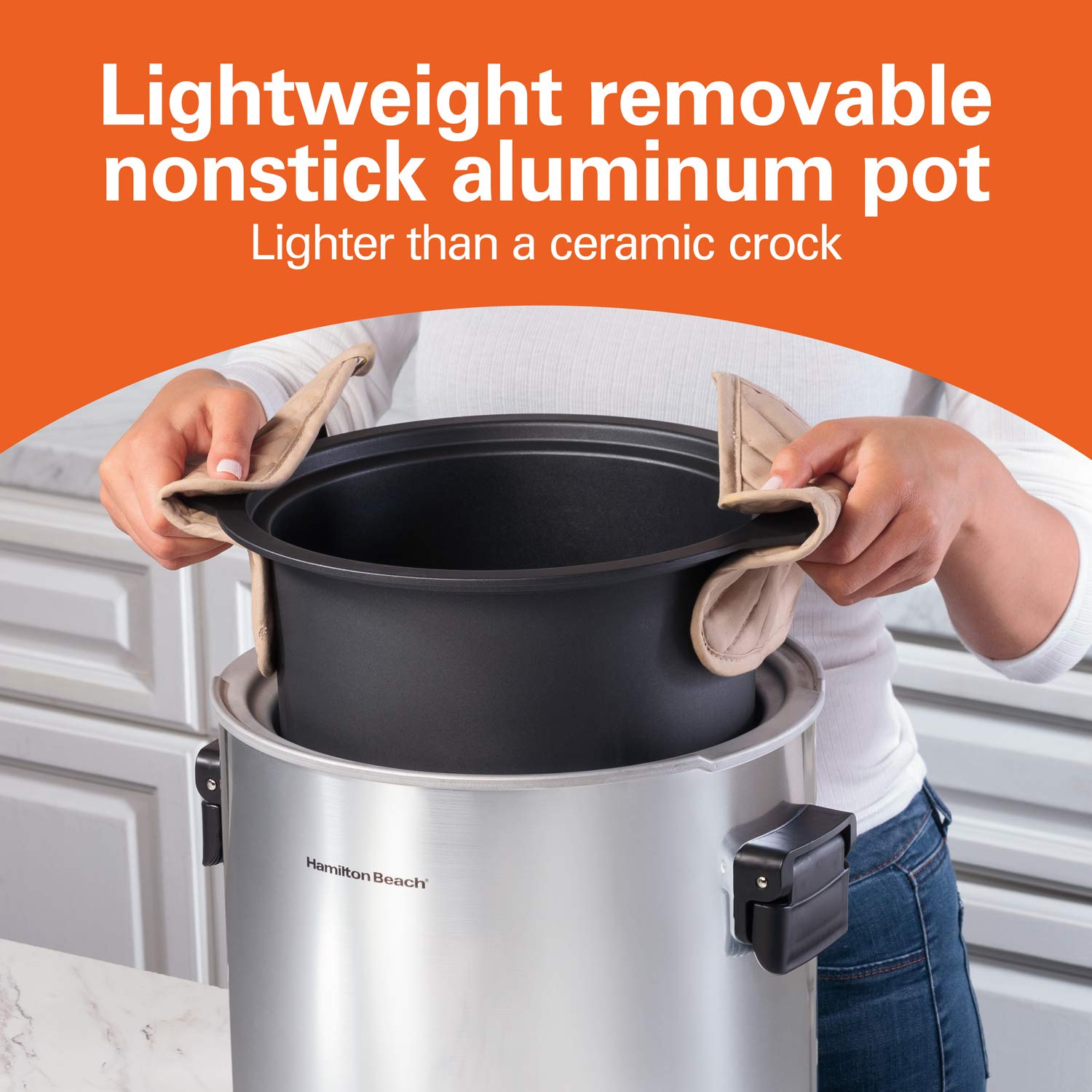 - LIGHTWEIGHT REMOVABLE NONSTICK ALUMINUM POT. The lightweight removable pot is lighter than a ceramic crock, so it’s easy to lift when the pot is full.