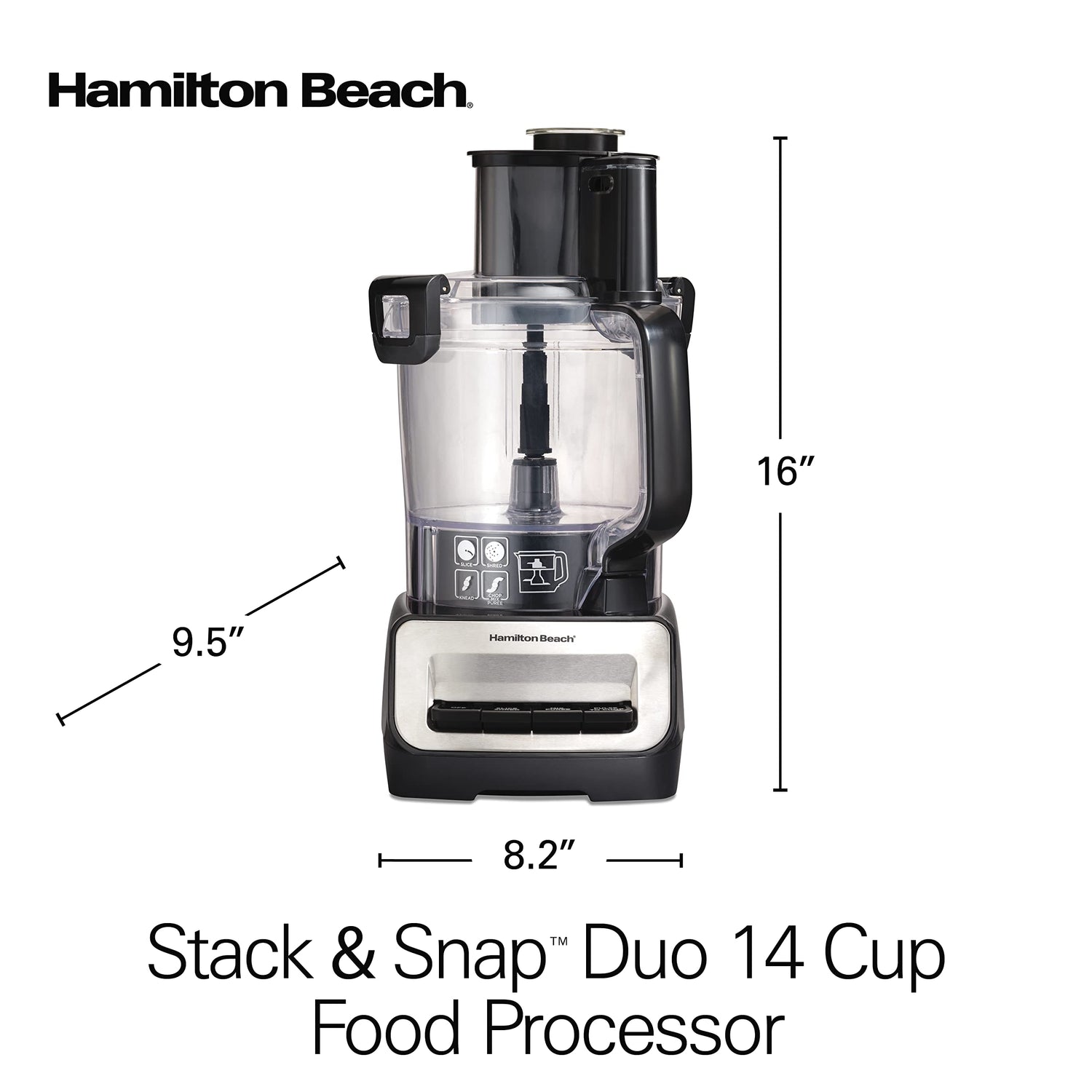 Details: The Hamilton Beach® Stack & Snap™ Duo Food Processor comes with a 14 cup bowl for large batches and a 4 cup bowl for smaller amounts. The stack & snap assembly and Big Mouth® feed chute save time and make it easy to use. Includes 4 attachments.