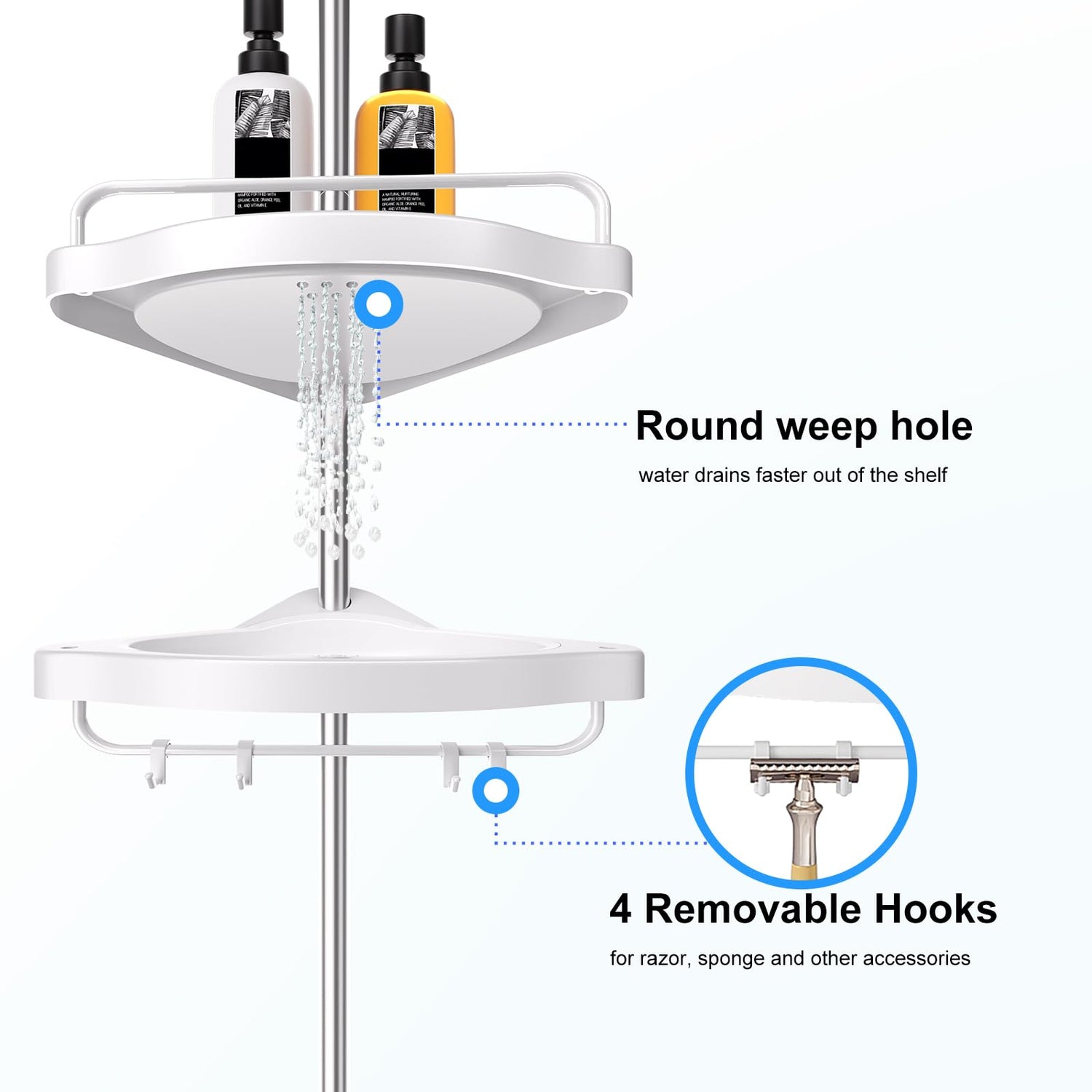- 4 LARGE SHELVES ORGANIZER: This shower pole caddy has 4 tier large trays, each shelf can storage 2 large pump bottles or 4 medium bottles. Ideal for contain bath supplies like shampoo, soap, conditioner, body wash with extra towel bar and hooks are able to hanging your towel, razor and more. It has a self-draining system, so it will not accumulate water and will keep your bath products clean and tidy