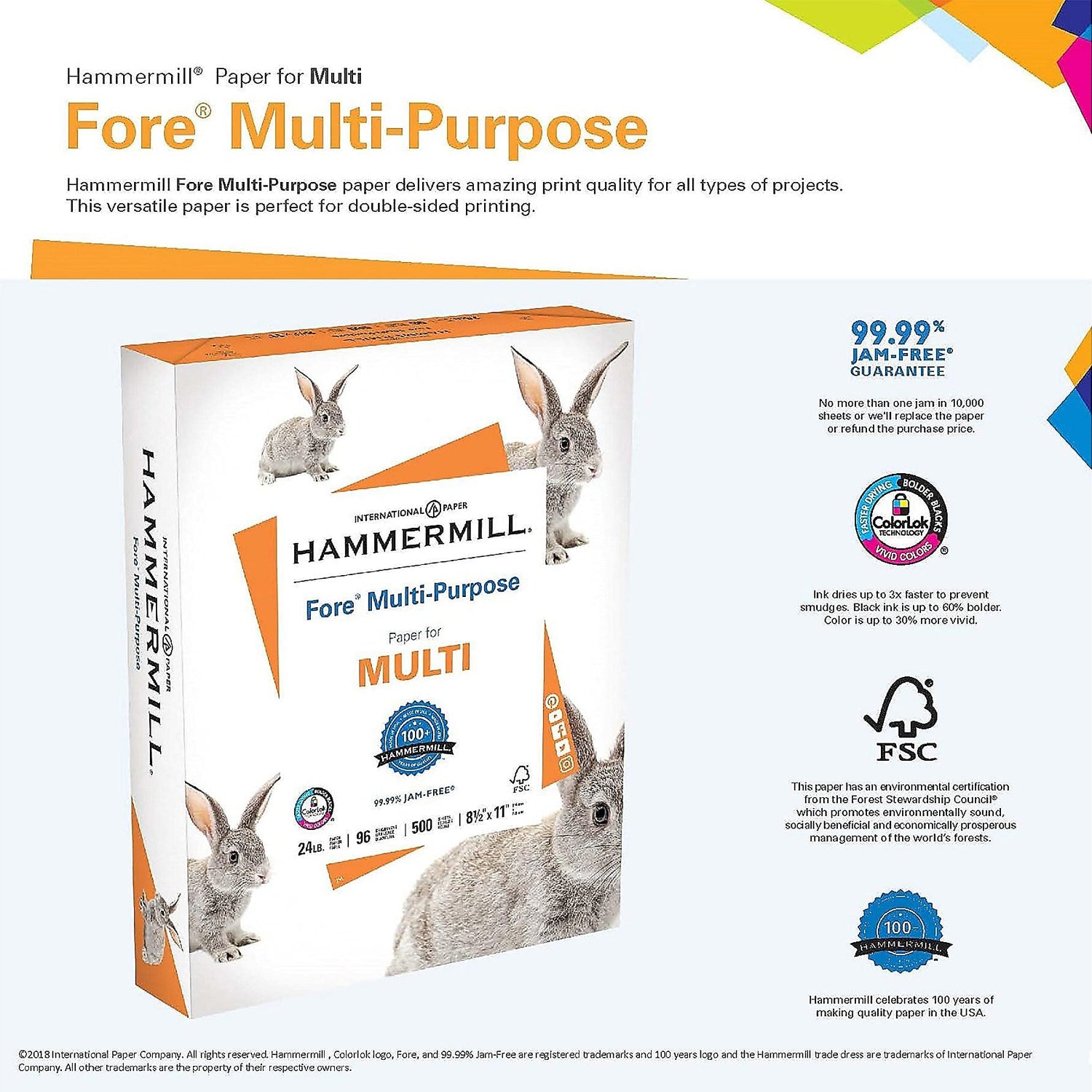 - MULTIPURPOSE COPY PAPER – Hammermill Fore Multi-Purpose 24lb Copy Paper is a high-quality option that runs well through electronic imaging equipment as well as conventional offset presses. 100% USA made to support millions of sustainable forestry jobs.