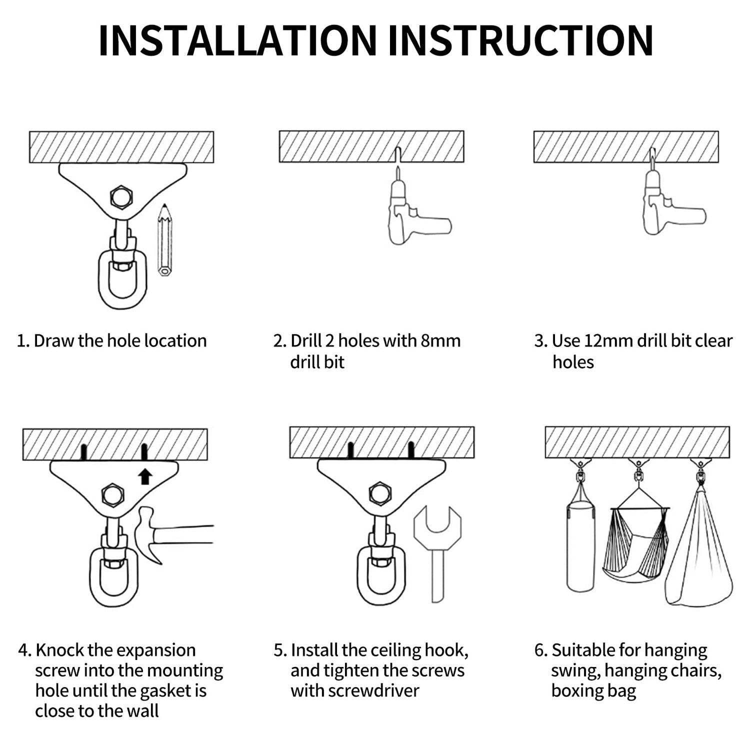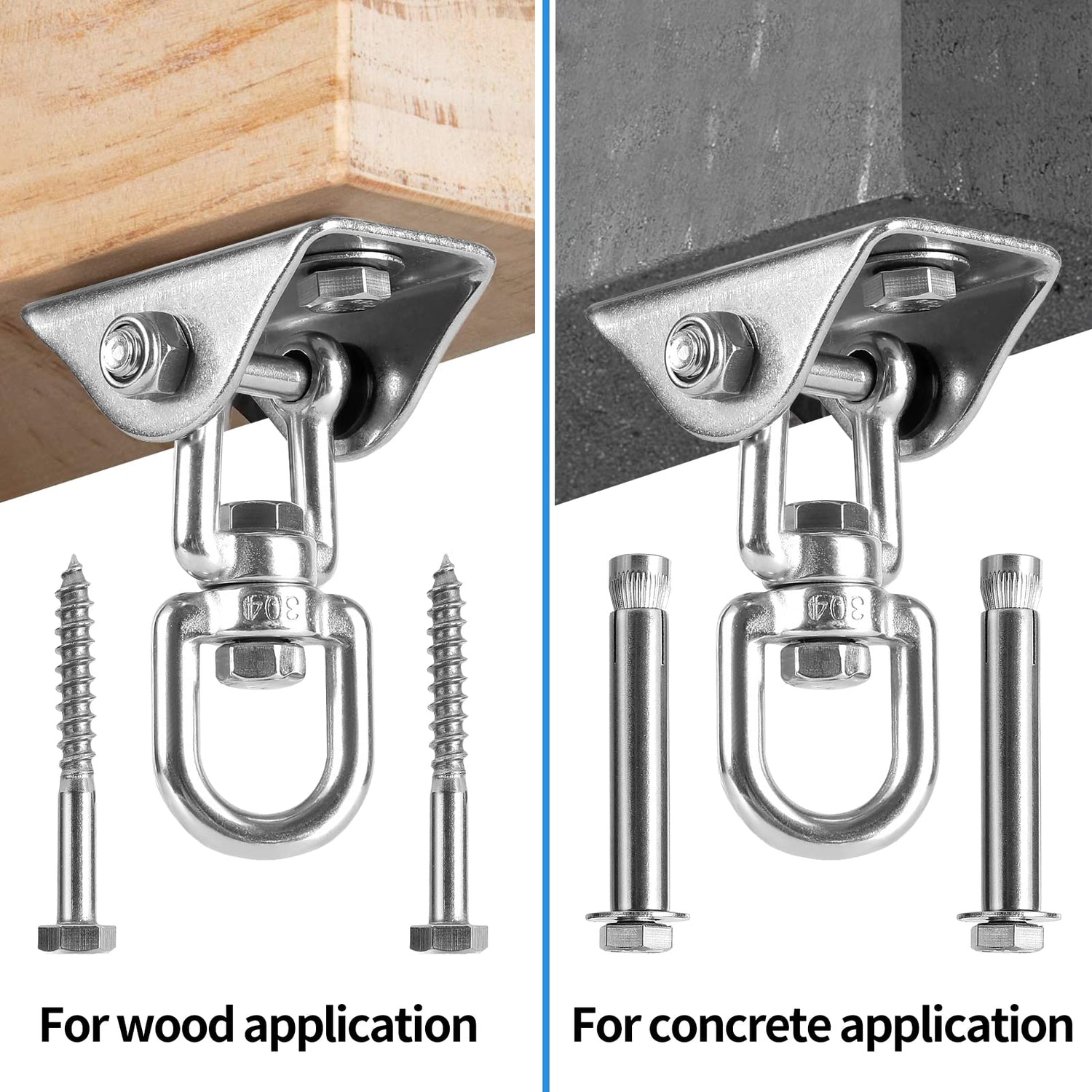 NOTE: 2 concrete anchor which fit concrete application and 2 hex lag bolts which fit wood application,meet your different needs. Perfect for hammock chairs swing,porch swings,swinging chairs, punching bags, or hanging any other heavy object of an overhead mount.