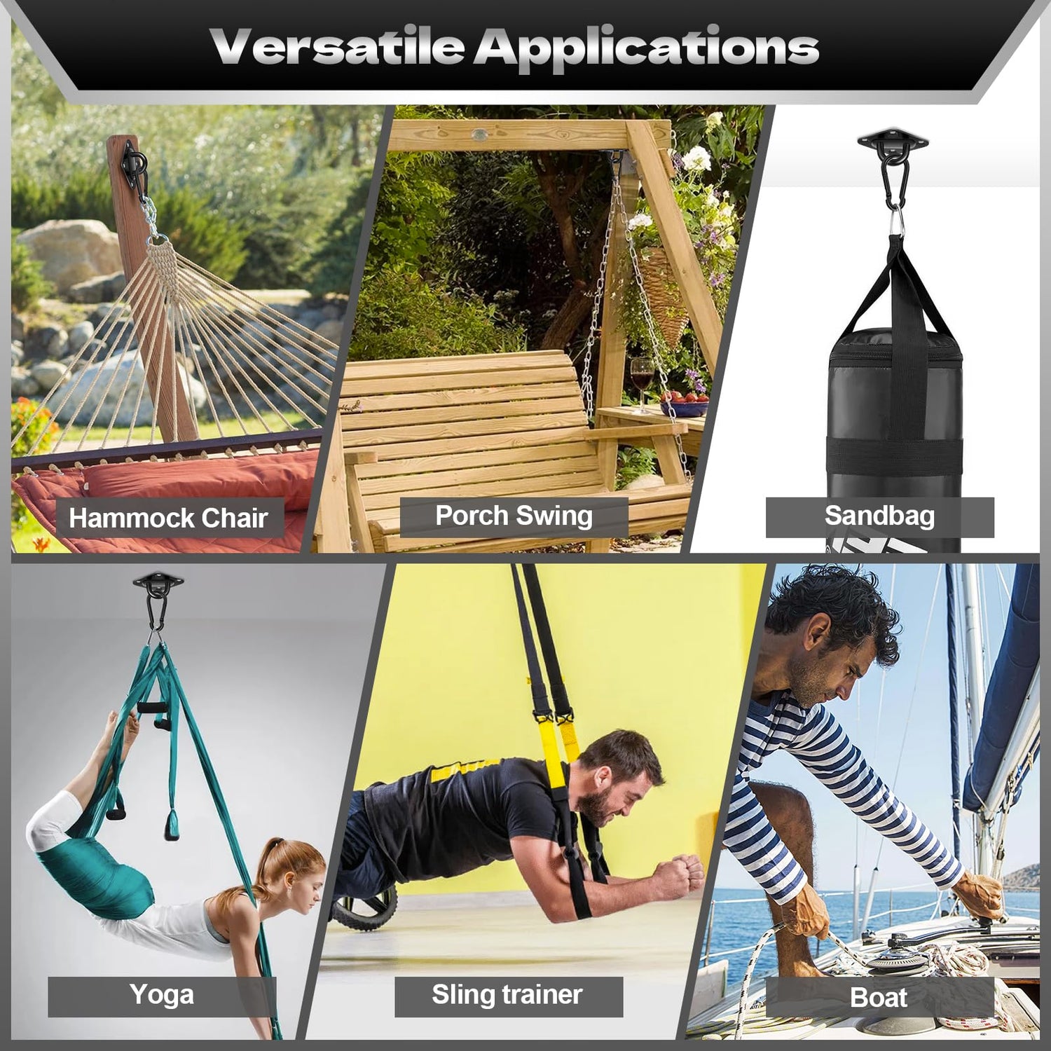 - Versatile Applications : From hammock chairs to porch swings and punching bags, Our wall anchors are ideal indoors and outdoors. Premium pad eye hooks and carabiners suit Garages, Rooms, Porches, Verandas, and More.