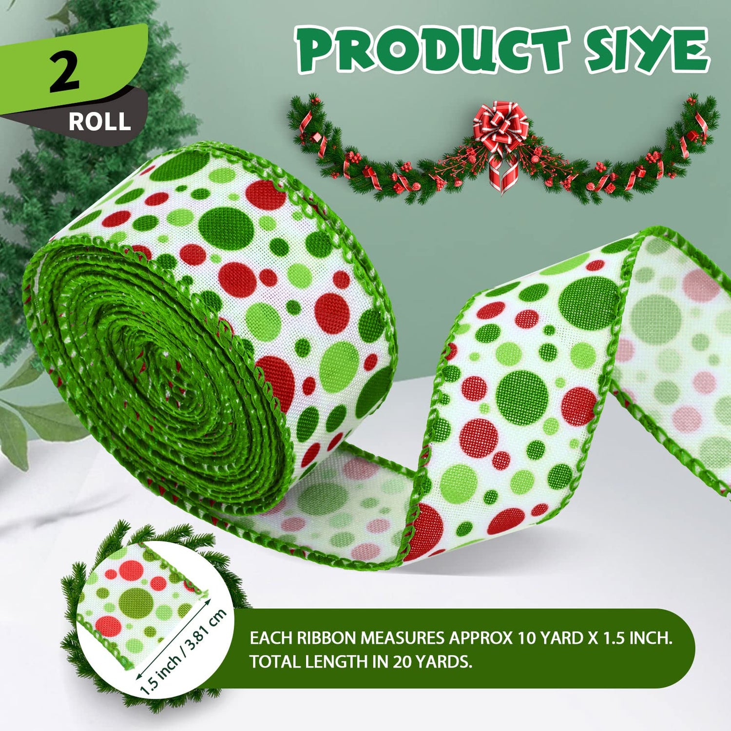 - What You Will Receive: the package comes with 2 rolls of Christmas green red dot wired ribbons, each roll is about 3.81 cm/ 1.5 inch in width, 10 yards in length, total of 20 yards, sufficient to meet your diverse DIY craft and decoration needs