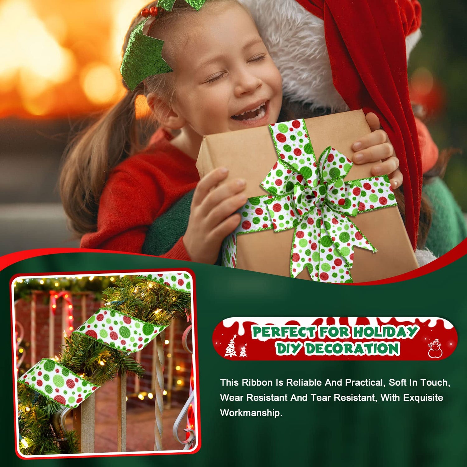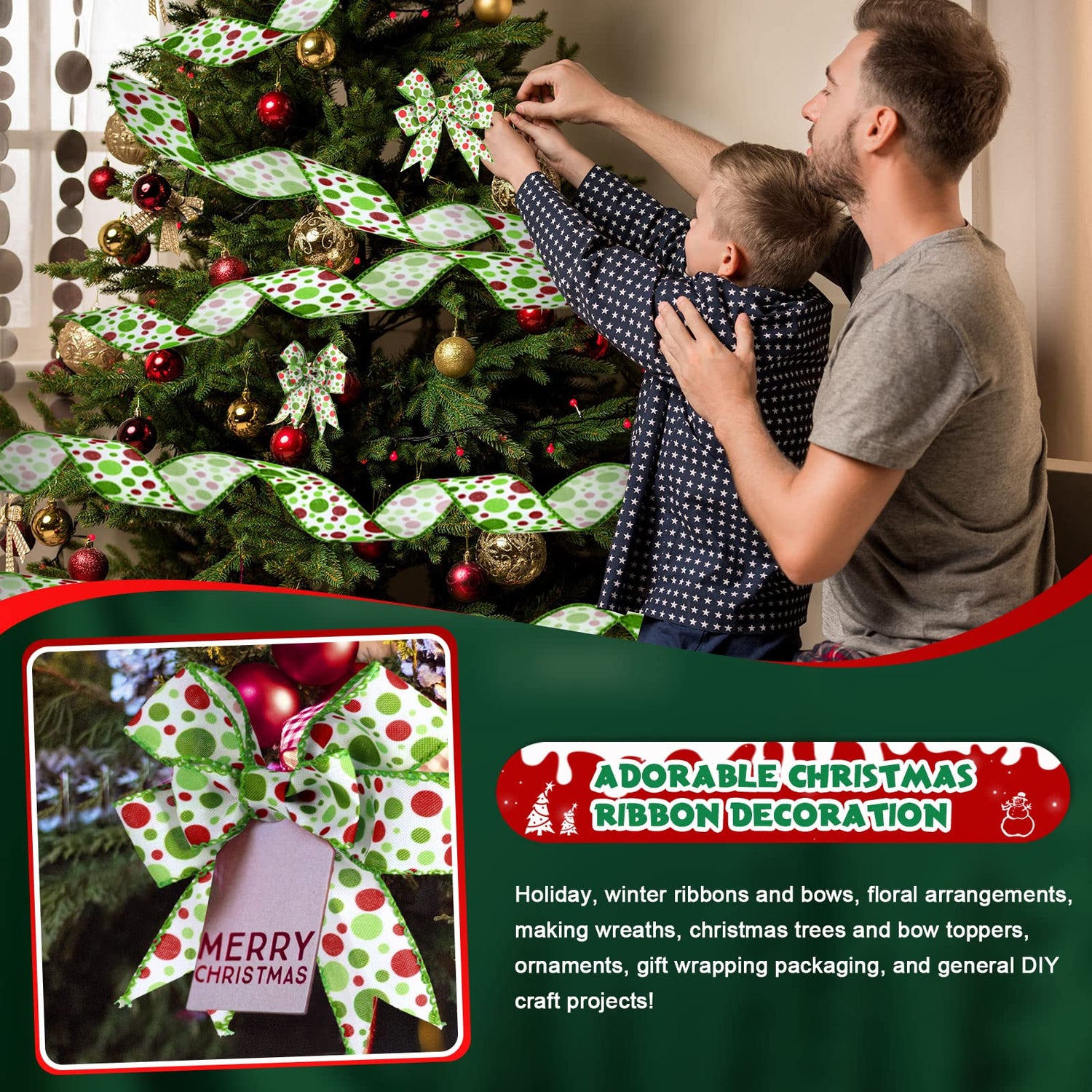 - Enjoy Your Fun of DIY: you can use the Christmas green red dot ribbon to make a lovely DIY craft and handicrafts with your family members and friends, to enhance your practical ability, strengthen your relationships, as well as let you relax yourself
