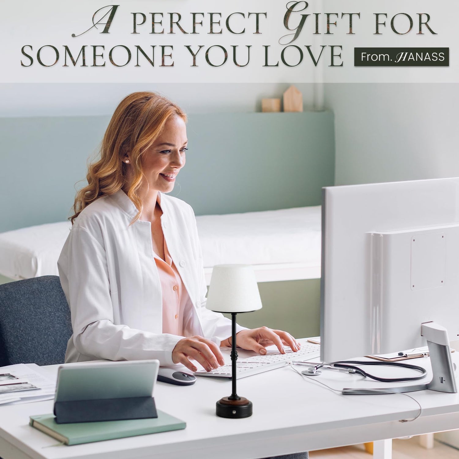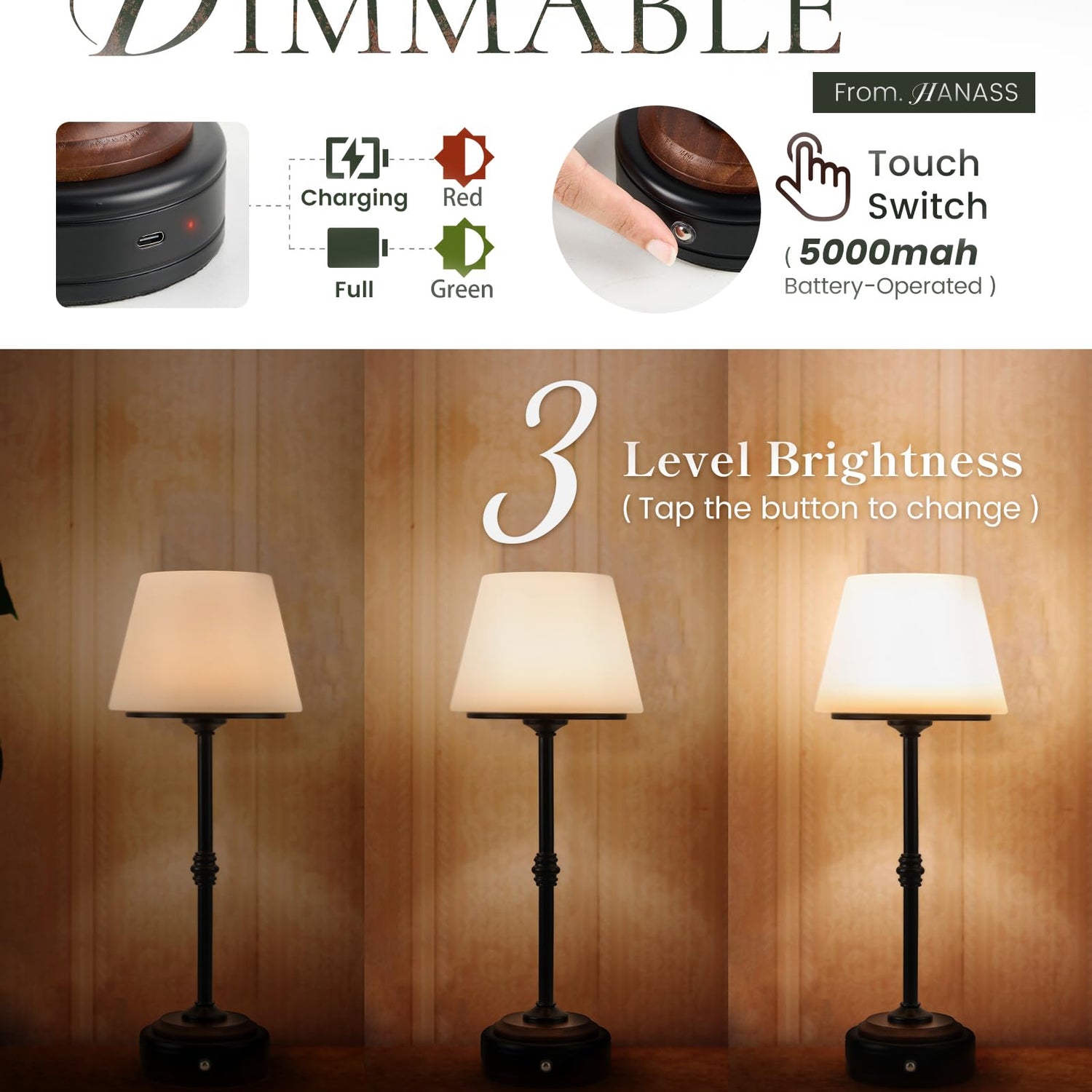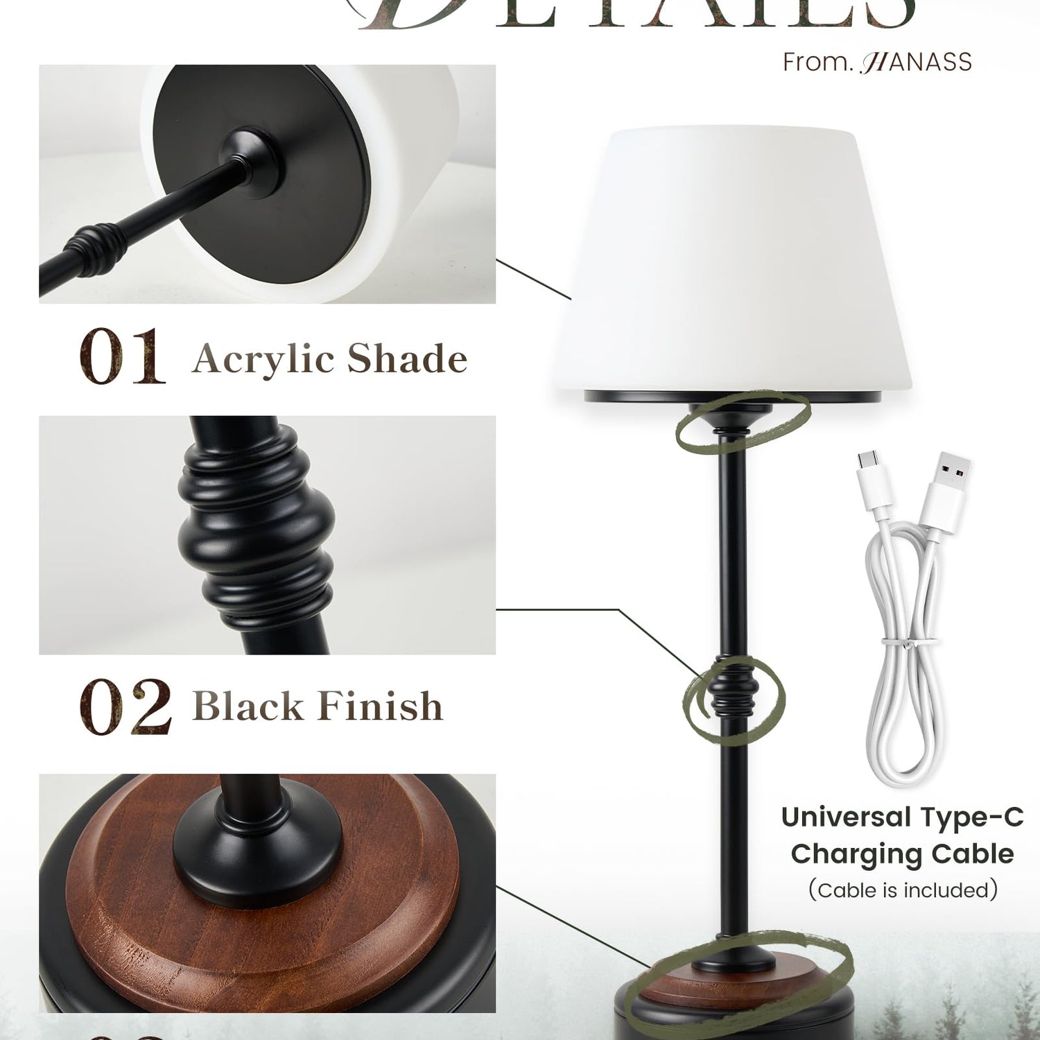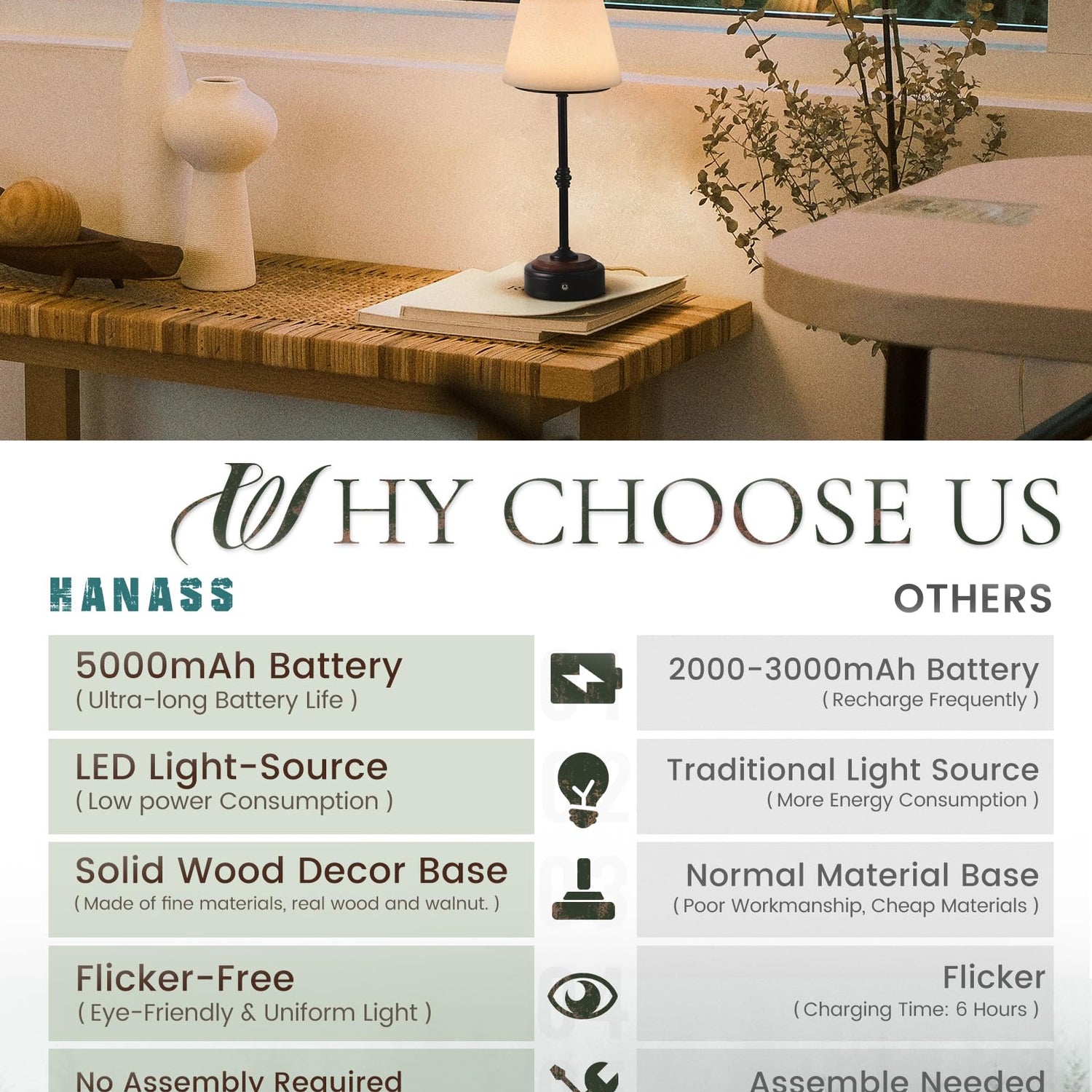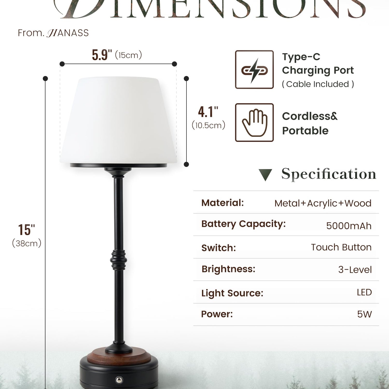 - Vintage Design - HANASS combines minimalistic metal design with a touch of retro flair. Its cordless feature allows you to place it anywhere, from console tables to patios, without worrying about power outlets. Available in antique brass or black, with a solid wood round base, it effortlessly complements your home décor or outdoor setting.