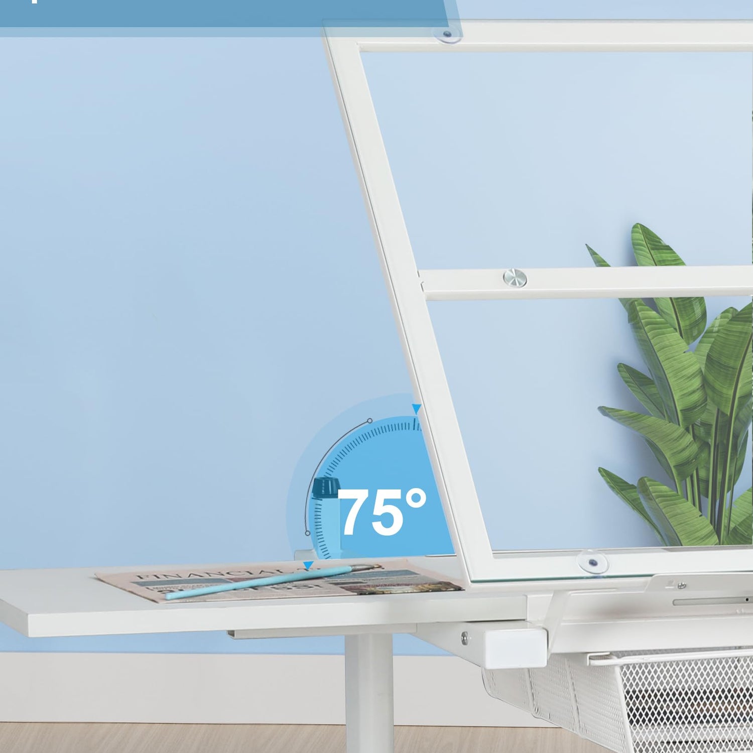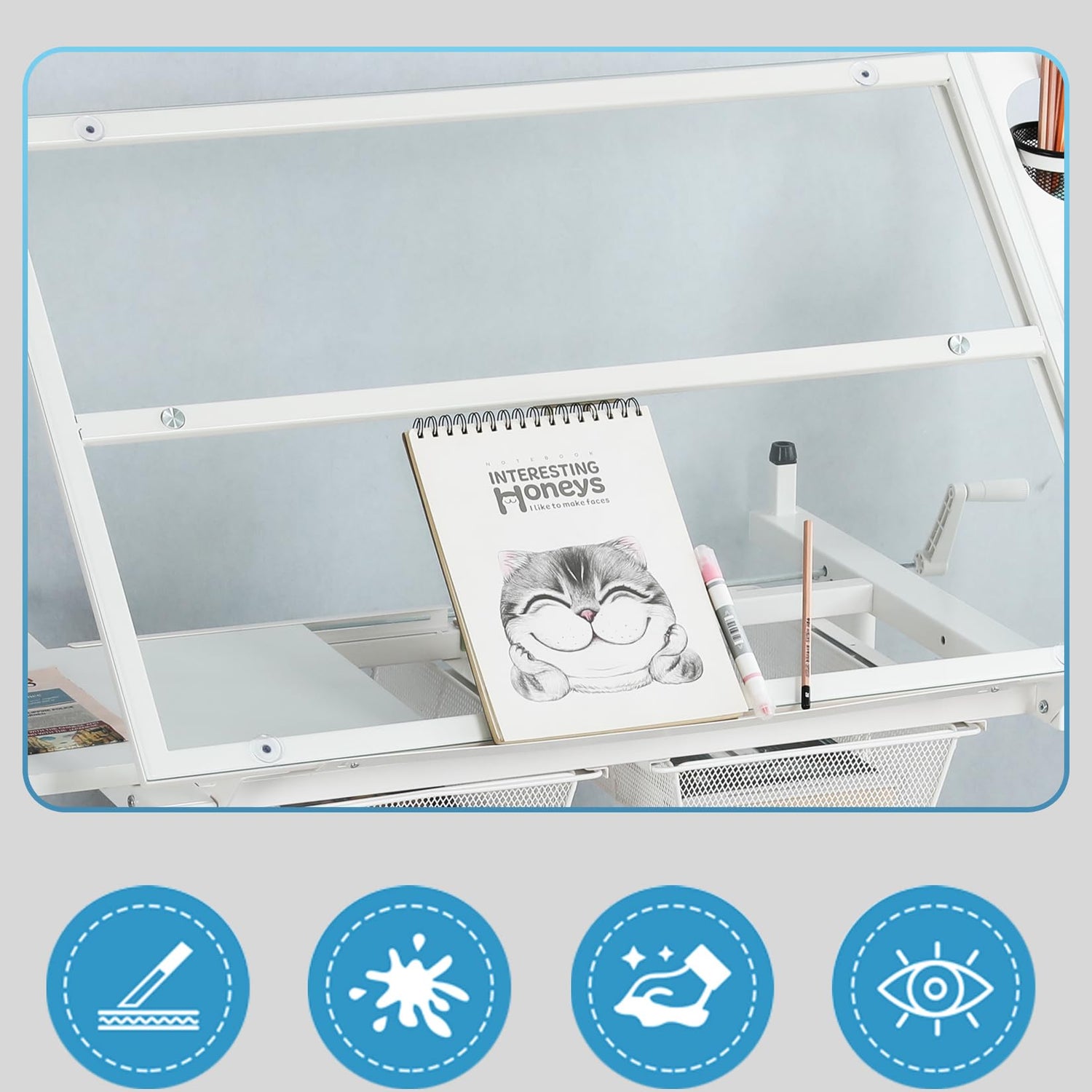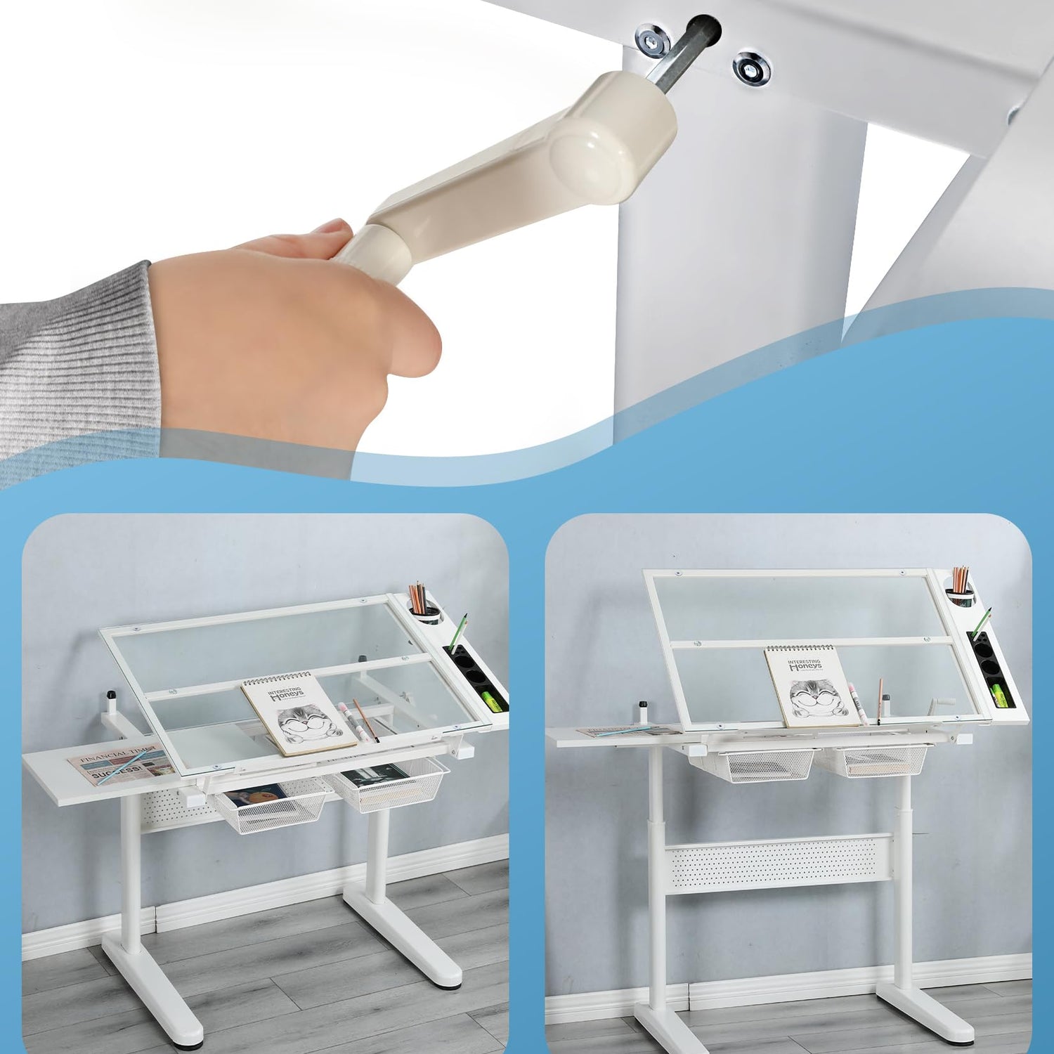 - This Height Adjustable Drafting Desk offers adjustable heights (29.5" to 42.3") and a tilting tabletop (0° to 75°), perfect for any task. The upgraded hand-crank mechanism makes height and angle adjustments quick and easy. With a durable tempered glass top and steel frame, it's built to last. Plus, it includes multiple compartments, a 24-inch pencil ledge, and hanging drawers to keep all your tools organized. Ideal for artists and creatives!