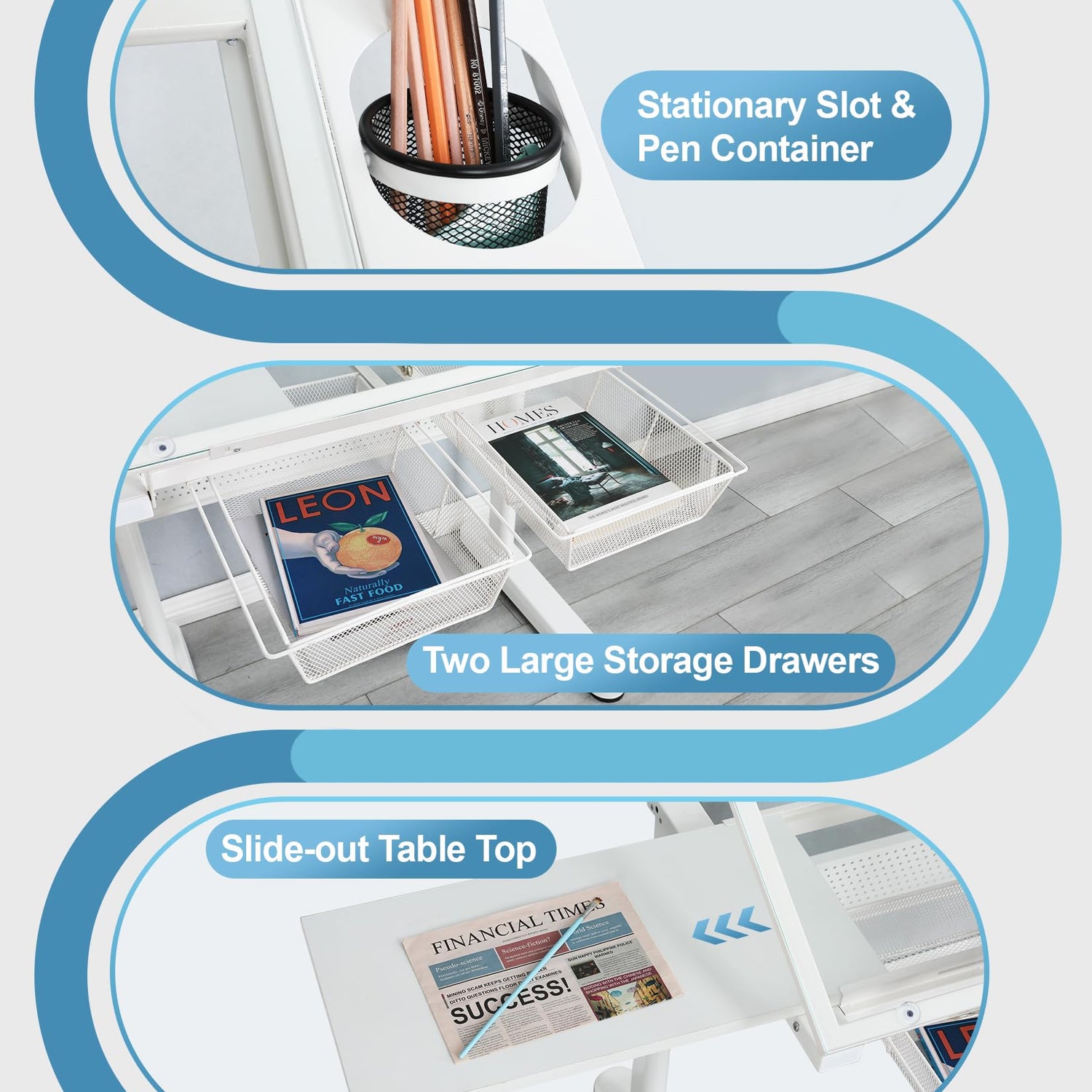 - Ample Storage & Accessibility: The desk has plenty of storage with multiple compartments and a 24-inch slide-up pencil ledge for extra space. The hanging drawers underneath hold all your supplies—paint, pens, brushes—keeping everything organized and within reach for your next project.
