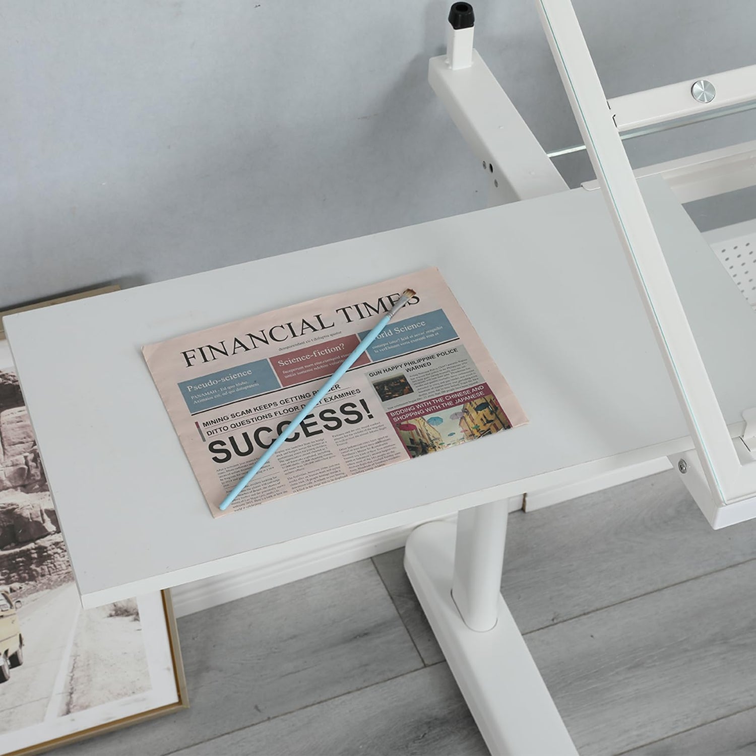 Hand Adjustable Height Drafting Table Artist Drawing Table Multifunctional Art Craft Artists Desk Tilting Glass Tabletop Glass Topped Art Desk Work Station With Stool and Chair for Home Office White