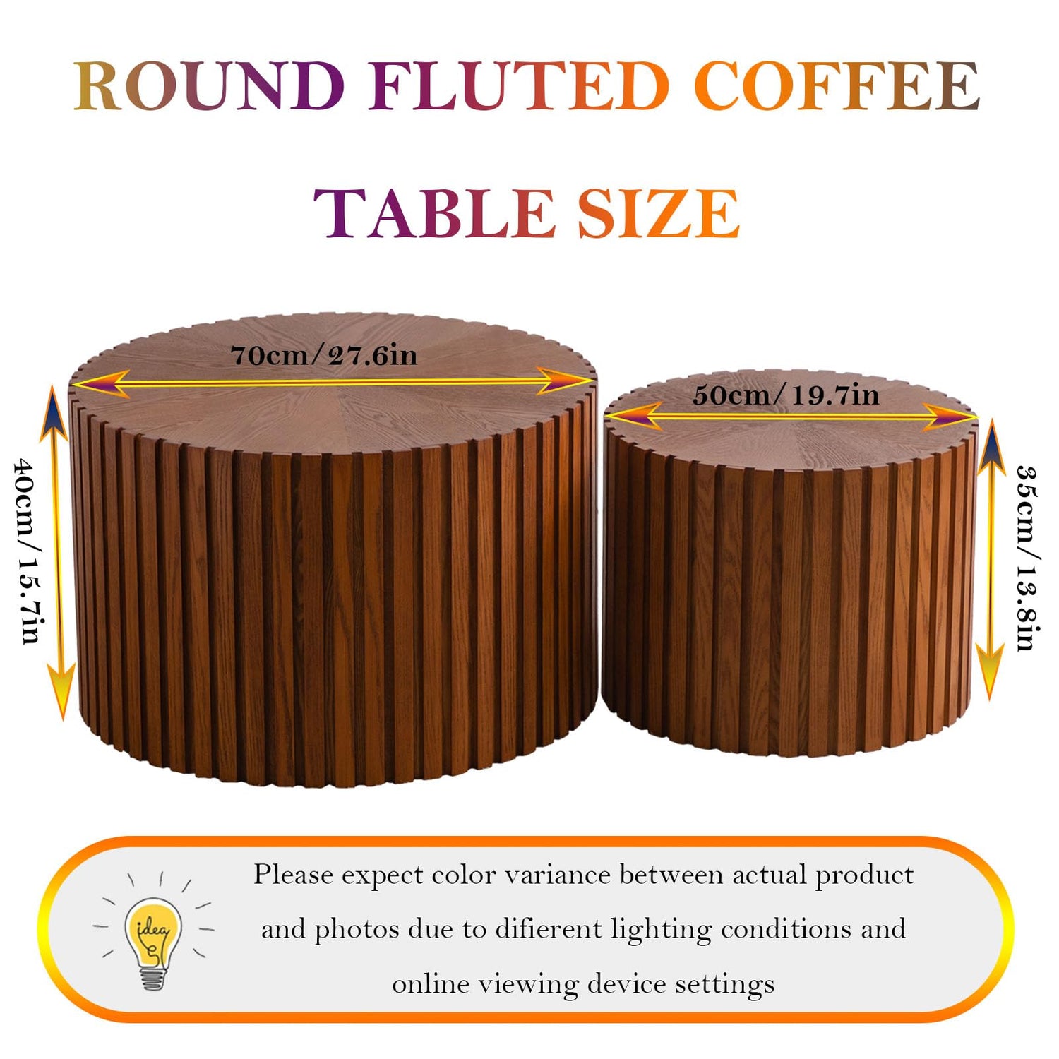 Handcraft Round Nesting Coffee Table - Chic Wave Stripe Edge, Modern Stylish Walnut Wooden Circle Fluted Center Table for Living Room (27.6in+19.7in)