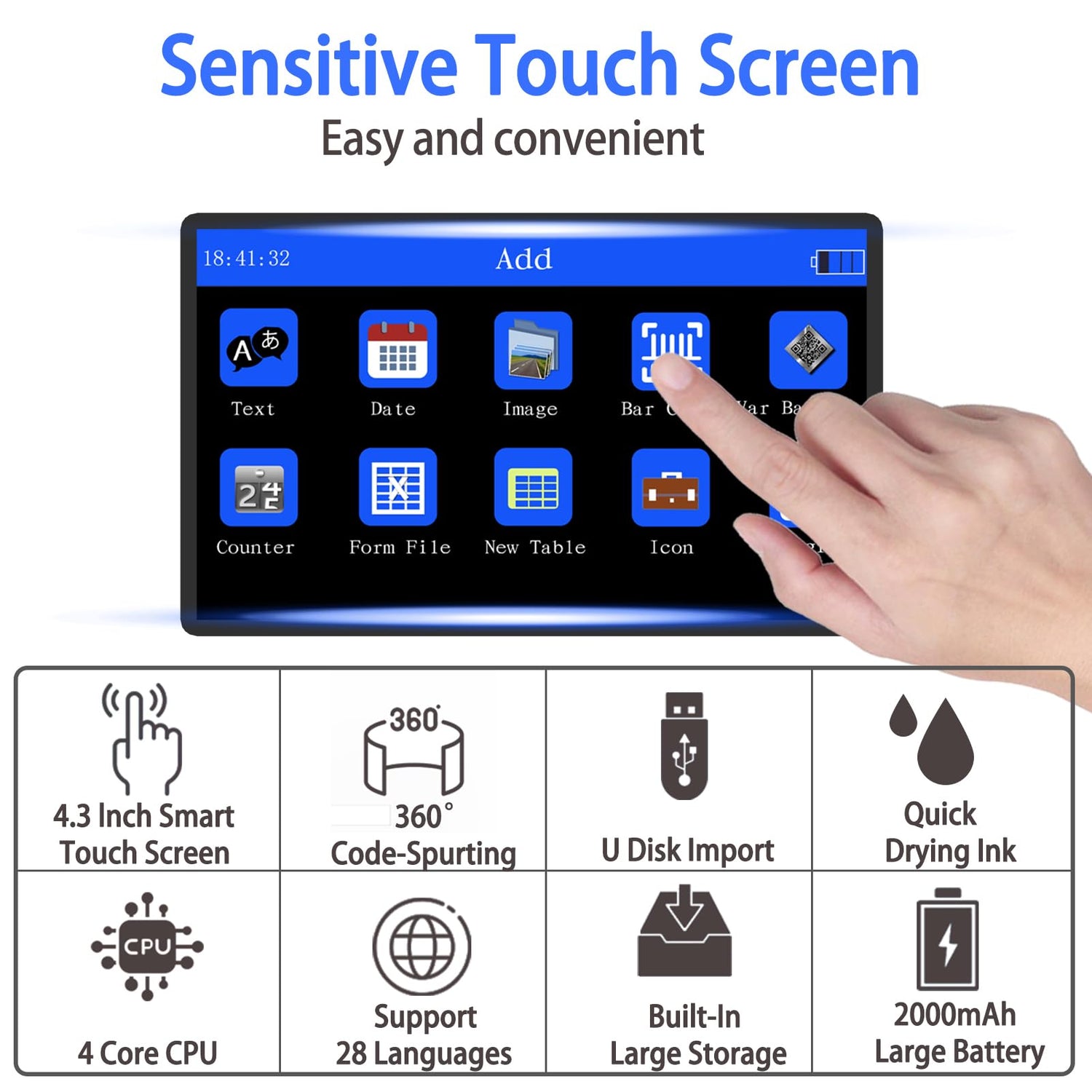 - Intelligent Handheld Inkjet Printer: The upgraded Handheld inkjet printer Imprint Machine features a 4.3-inch resistive touchscreen with a high resolution of 600 dpi, ensuring a clear and responsive display. The system operates stably, and the removable 2000mAh battery ensures long-lasting endurance for uninterrupted usage. The user interface is designed to be simple and intuitive, providing fast feedback.