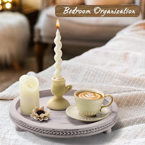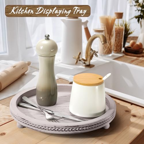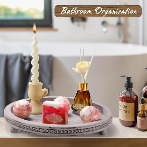 Wooden Tray Decor, Small Beaded Coffee Table Tray Decor, Gray Round Decorative Tray for Coffee Table, Dining Room Table Entryway and Living Room Table