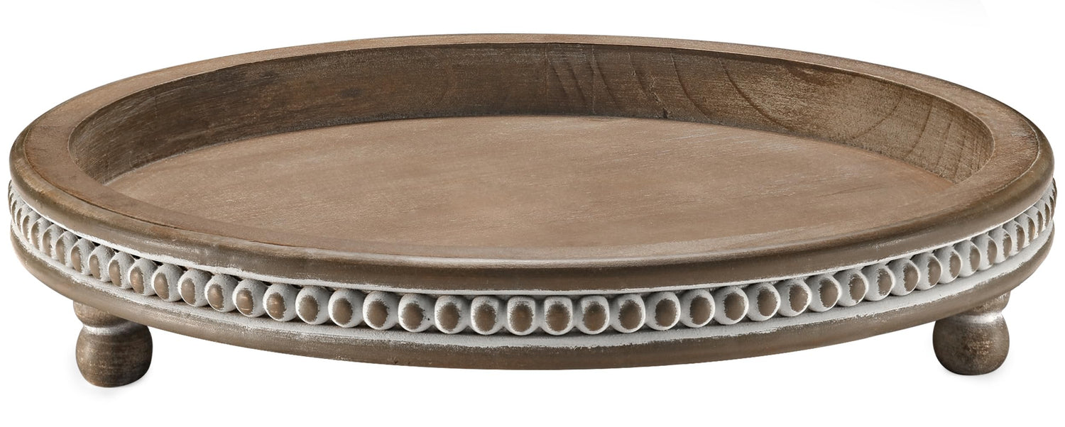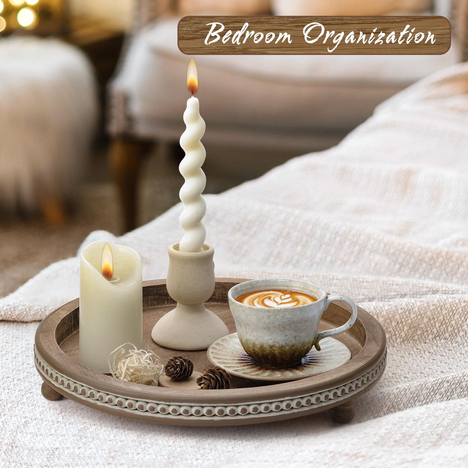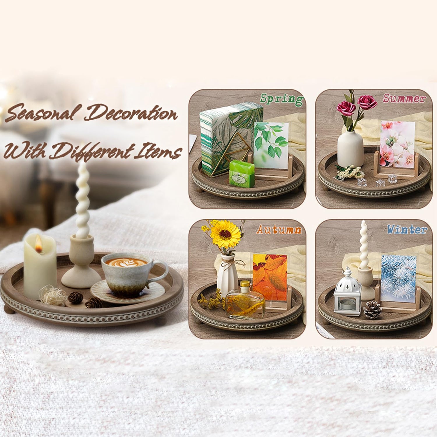 Handmade Wooden Serving Tray, Small Beaded Coffee Table Tray Decor, Warm Brown Round Decorative Tray for Coffee Table, Dining Room Table Entryway and Living Room Table