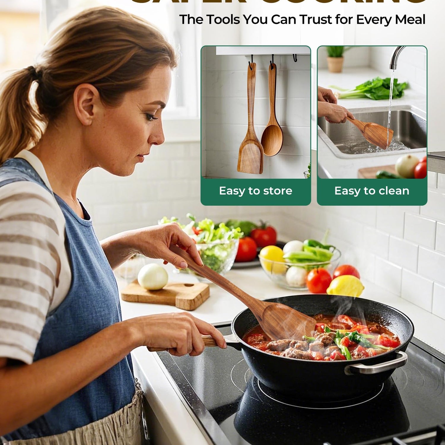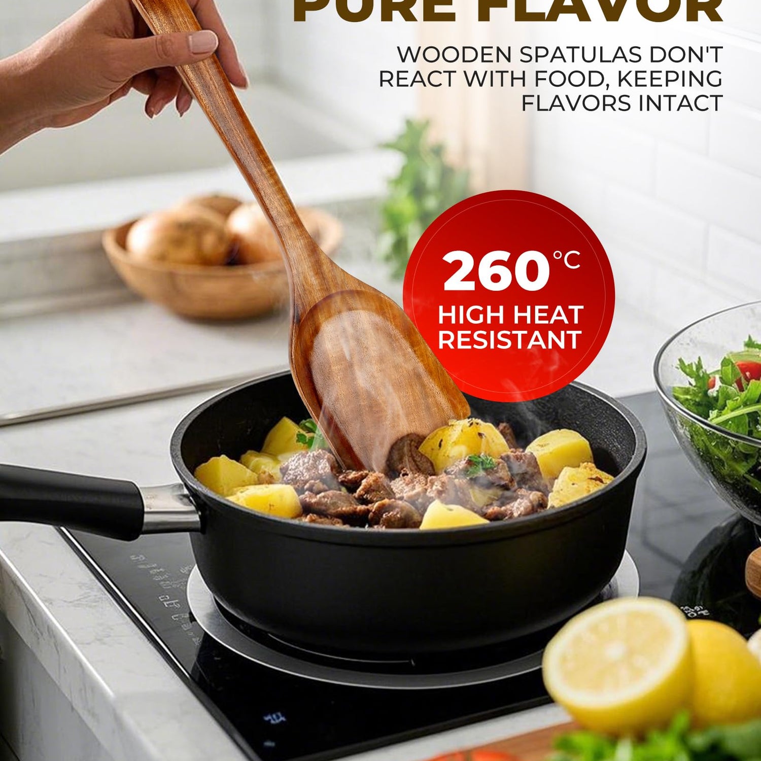 - 【Heat-Resistant Wooden Spatula】: The Wooden Spatula in this set doesn’t conduct heat, offering a comfortable and safe grip while stirring, flipping, or tasting your food. Designed to resist heat transfer, it ensures that you can cook with ease and confidence without worrying about burning your hands. Perfect for use in high-temperature cooking, this spatula is an essential tool for every kitchen.