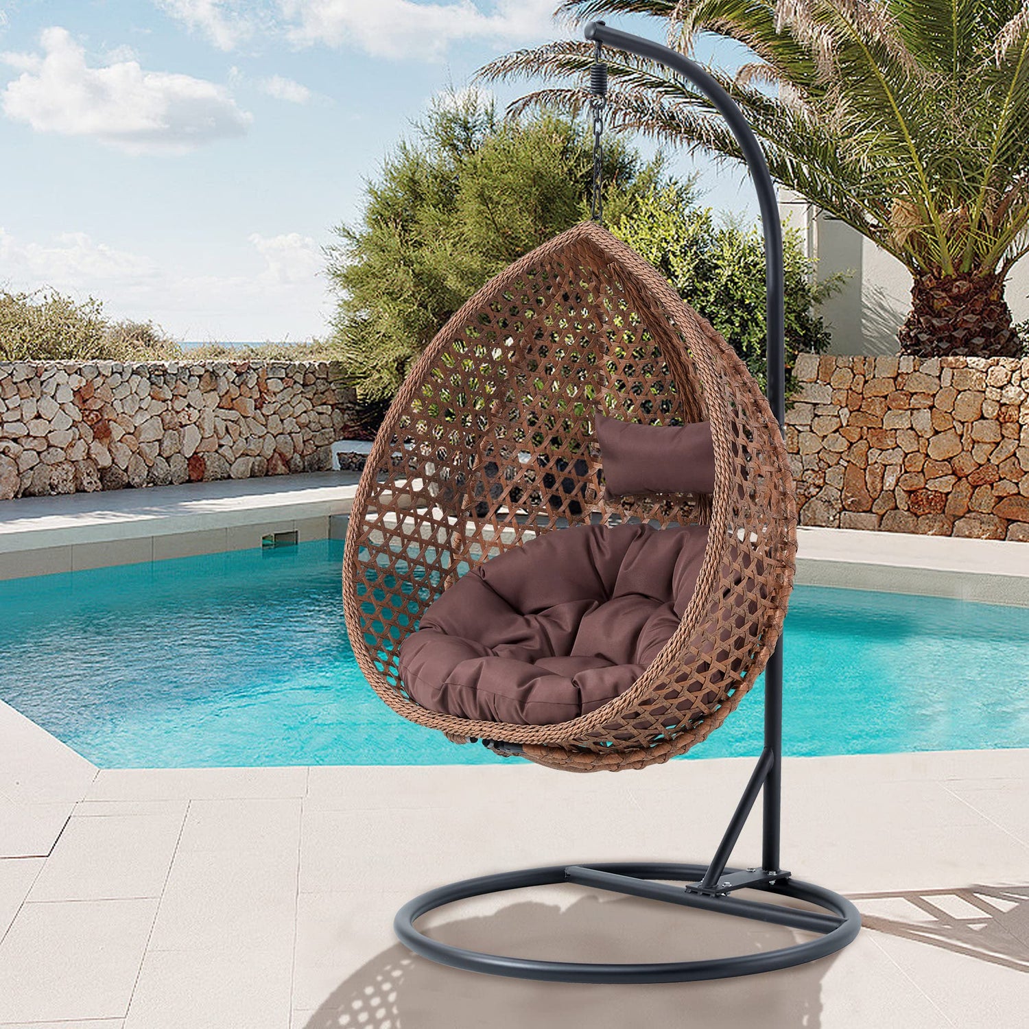 Hanging Egg Chair with Stand & Cushions, Outdoor and Indoor Hammock Rattan Swing Chair 350 lbs Capacity with Aluminum Steel Frame for Patio, Balcony, Backyard and Living Spaces (Dark Brown)