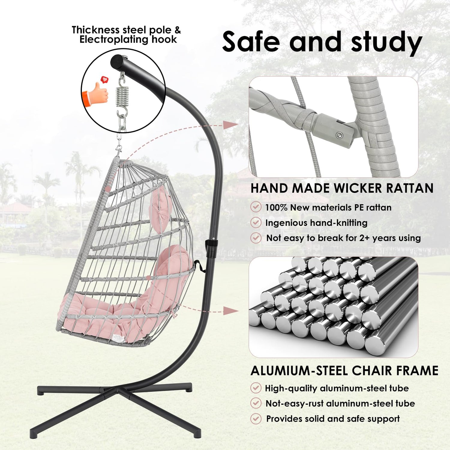 - Strong aluminum steel frame & all-weather PE rattan - Our frame uses a combination of aluminum and steel, making it very sturdy and strong overall, our egg chair frame is premium and not easy to rust, it can remain beautiful and strong for a long time. Wrapped around with all-weather PE rattan resin wicker, greatly increases the strength and durability of the chair for more than 2 years of use.